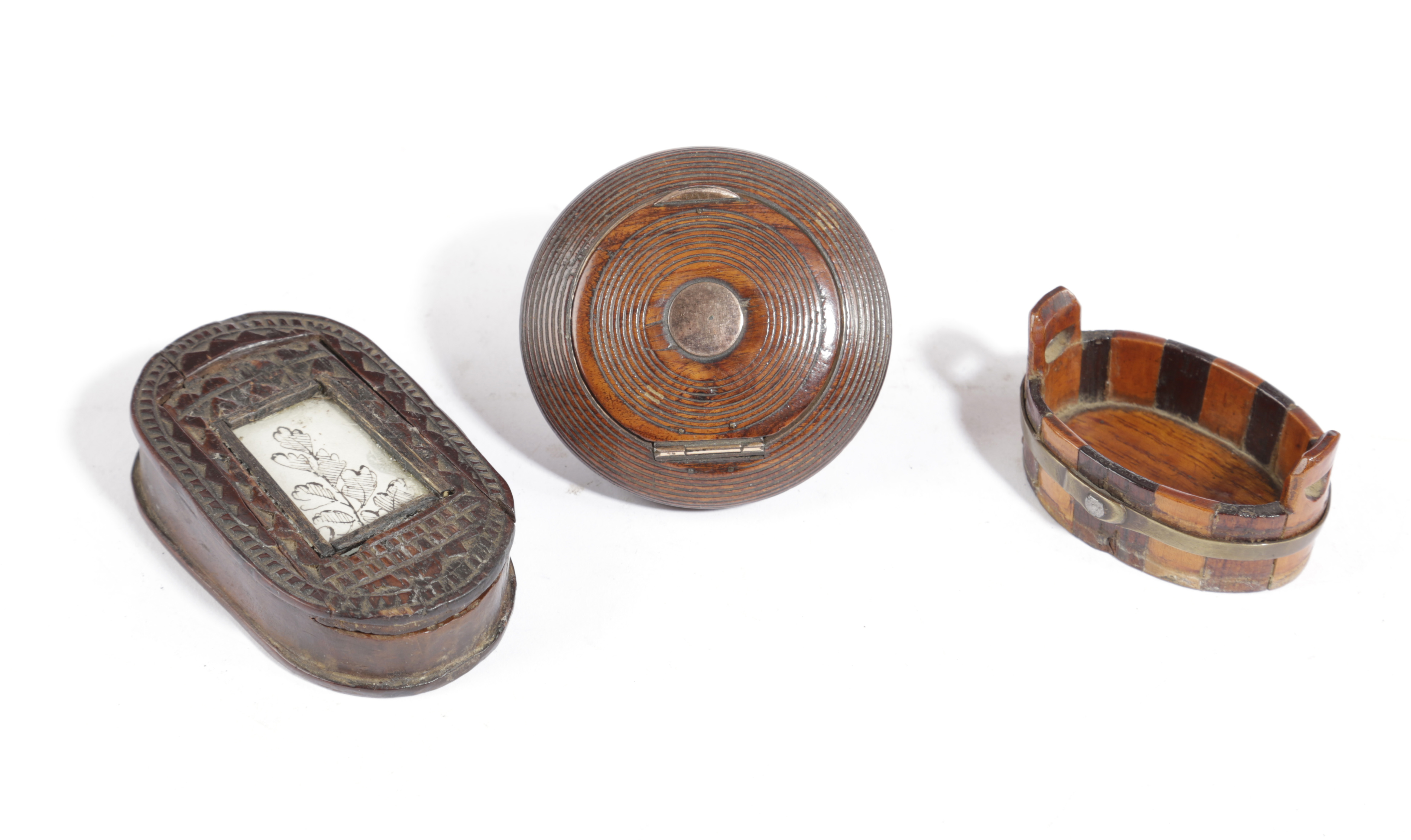 of staved construction of alder and sycamore, brass bound the underside inscribed in ink 'S. Cooke Jany 28th 1839', a Victorian rosewood and copper mounted disc snuff box, together with a treen chip carved snuff box, with a sliding cover (3)