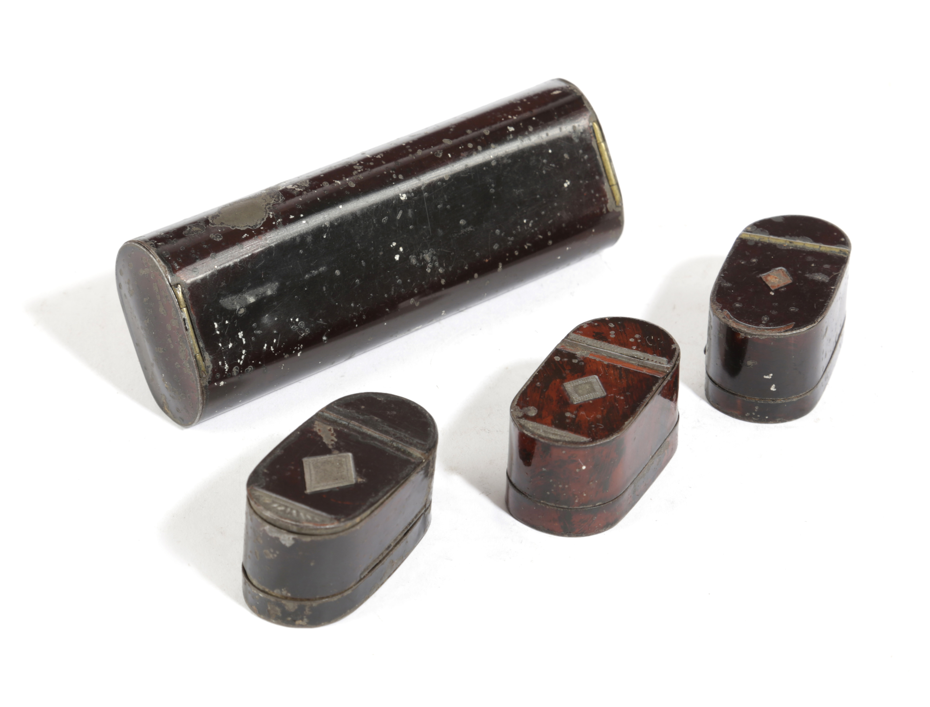 painted to simulate tortoiseshell, each with a hinged lid and base together with a tole tobacco box, with a hinged top and end with a pipe compartment (4)