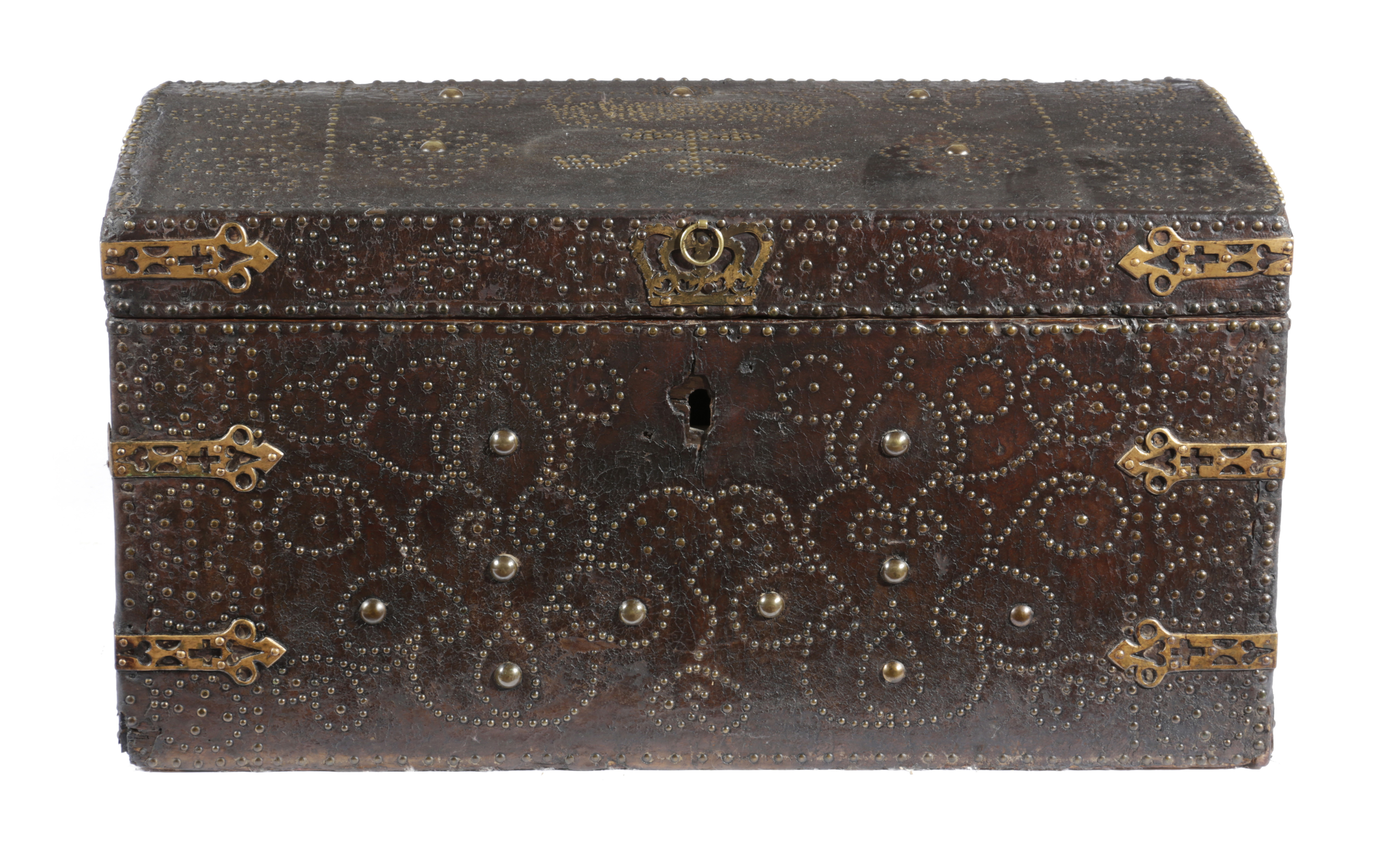 the slightly domed lid decorated with a crown and tulips, the front with a crown escutcheon and with scroll designs, the interior with traces of original marbled paper lining