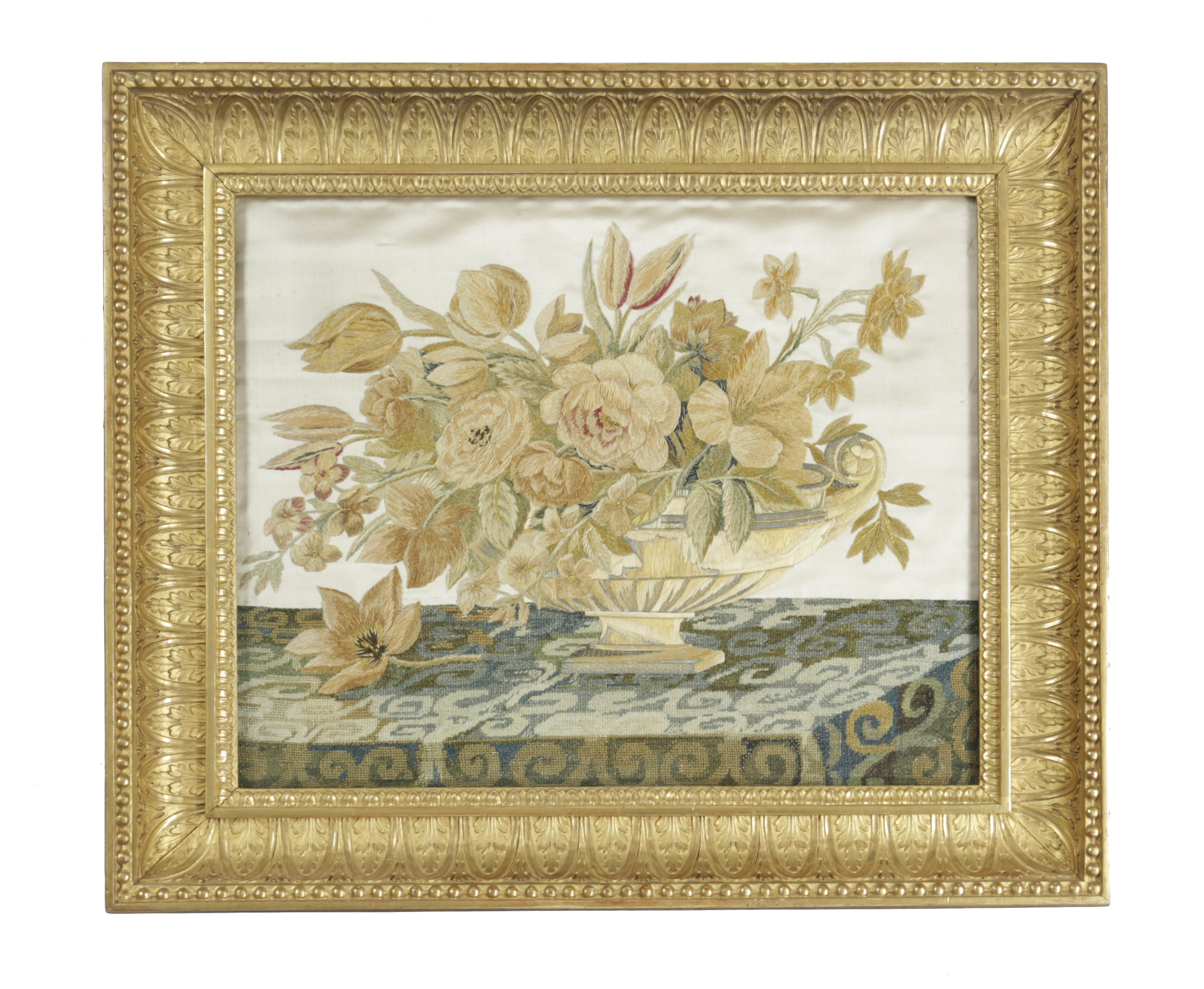 worked in silk, gilt and silver threads depicting a basket and vase of flowers on table cloths in gros and petit point, in gilt gesso frames (2)