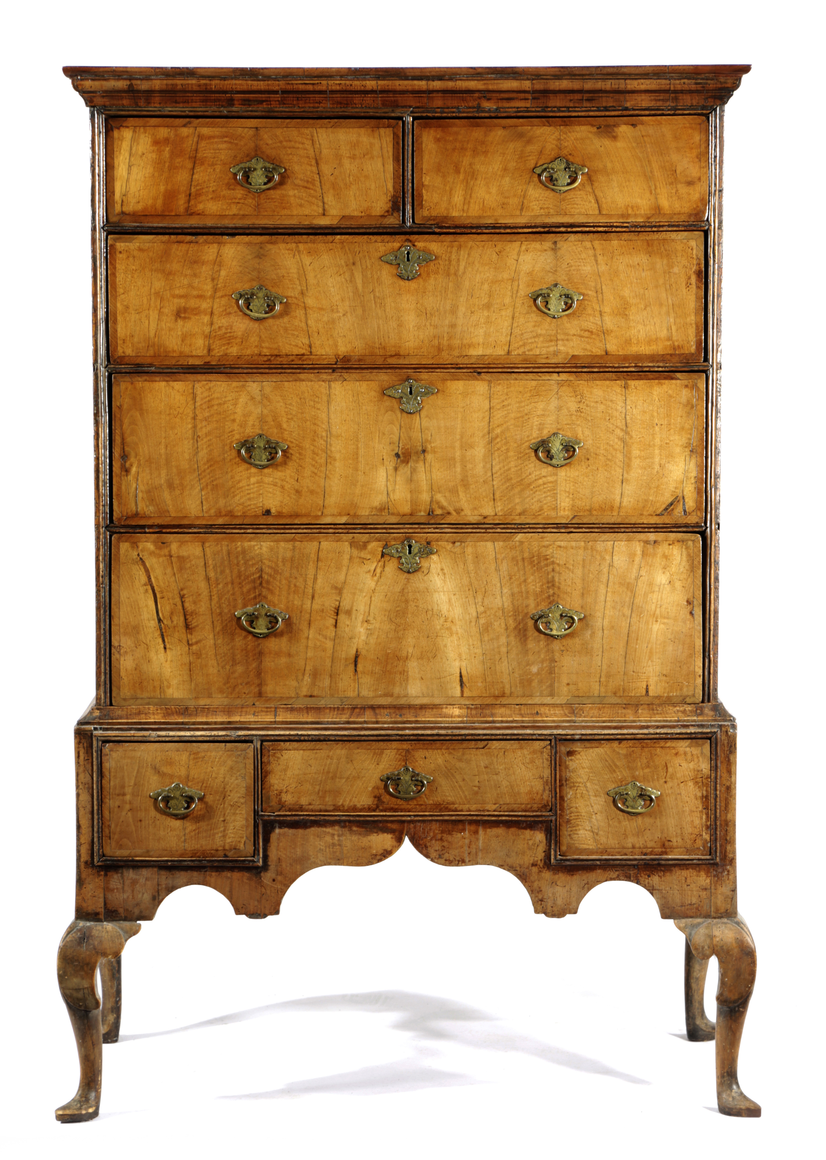 with two short and three long crossbanded drawers, the stand with three further conforming drawers