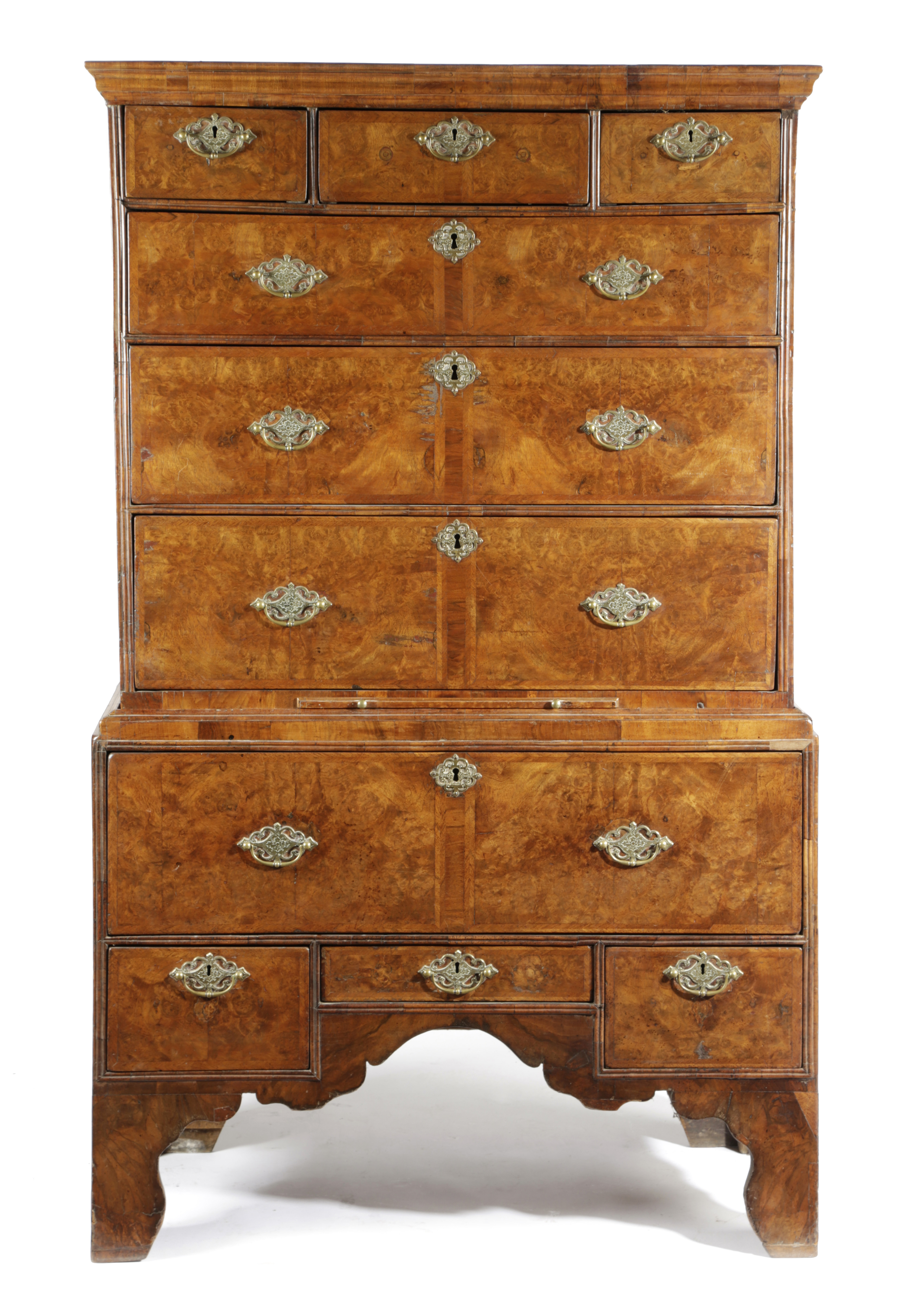 with feather banding, the top with three short and three long burr veneered drawers, above a slide, the base with a deep drawer and three short drawers on later bracket feet