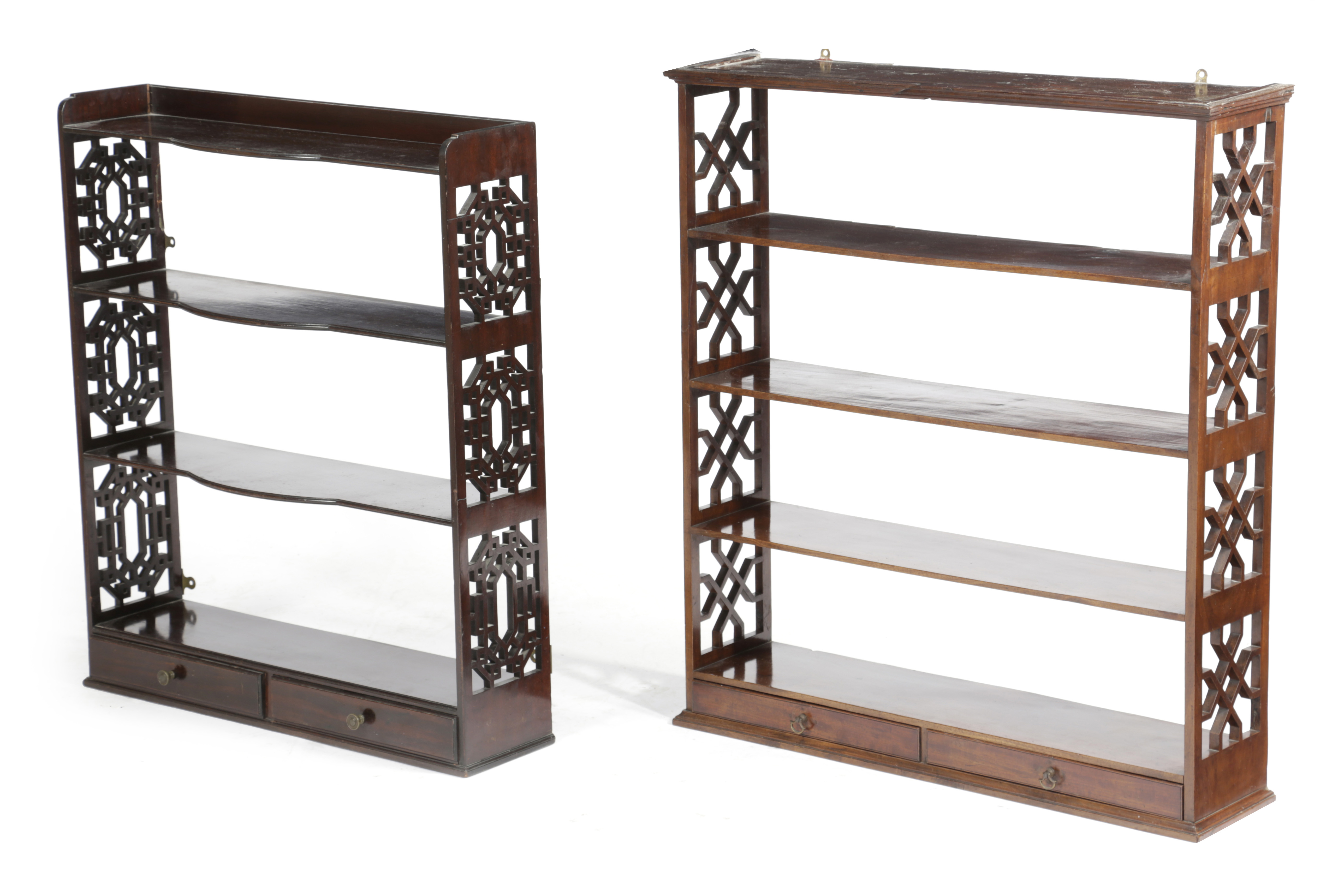 with pierced ends, the base with a pair of drawers, together with a similar later set of shelves (2)