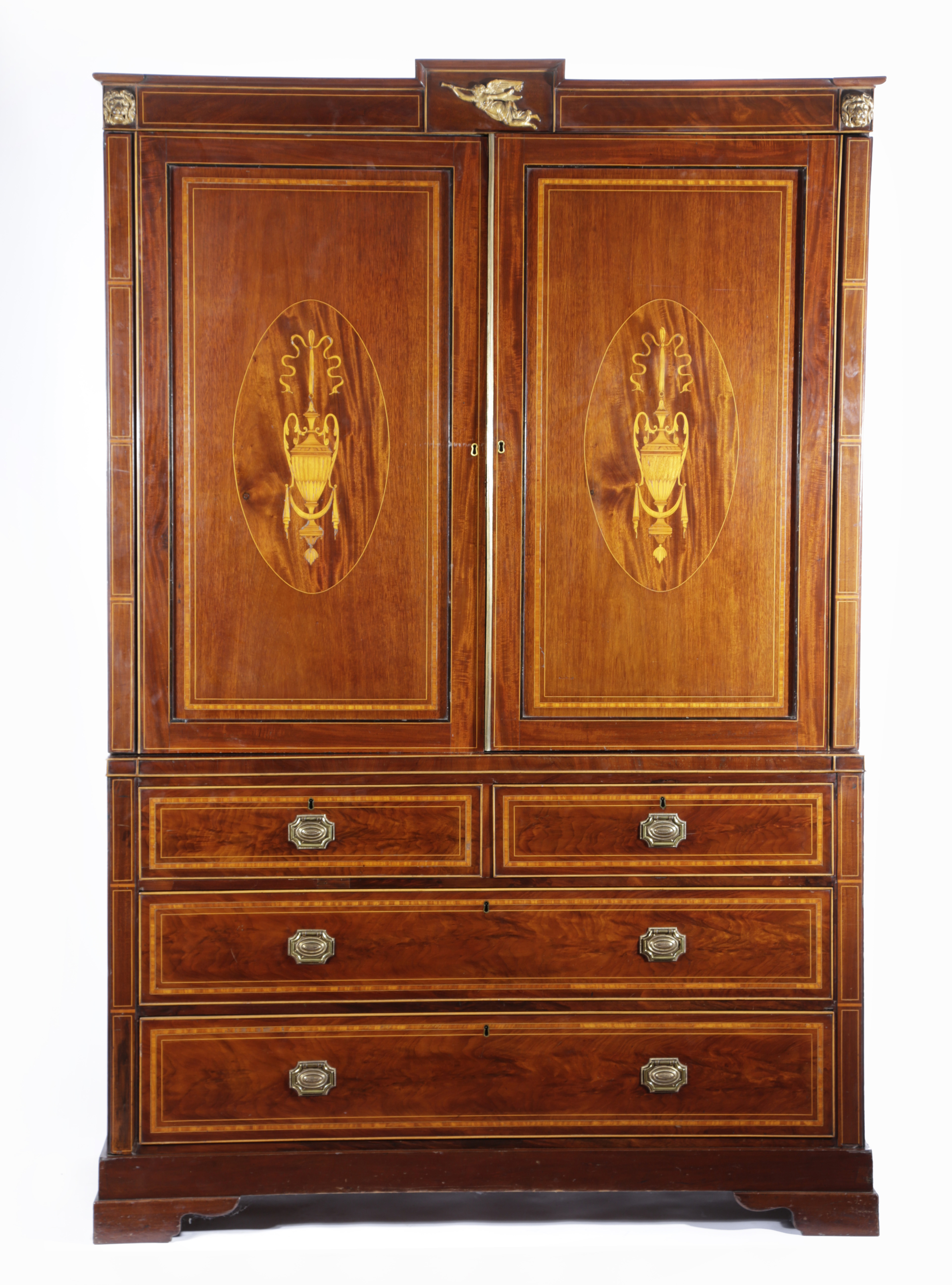 inlaid with stringing, satinwood banding and classical marquetry with ribbon tied urns, the detachable cornice decorated with an applied giltwood figure of Victory and a pair of lion masks, with a pair of panelled doors enclosing five slides, above two short and two long drawers