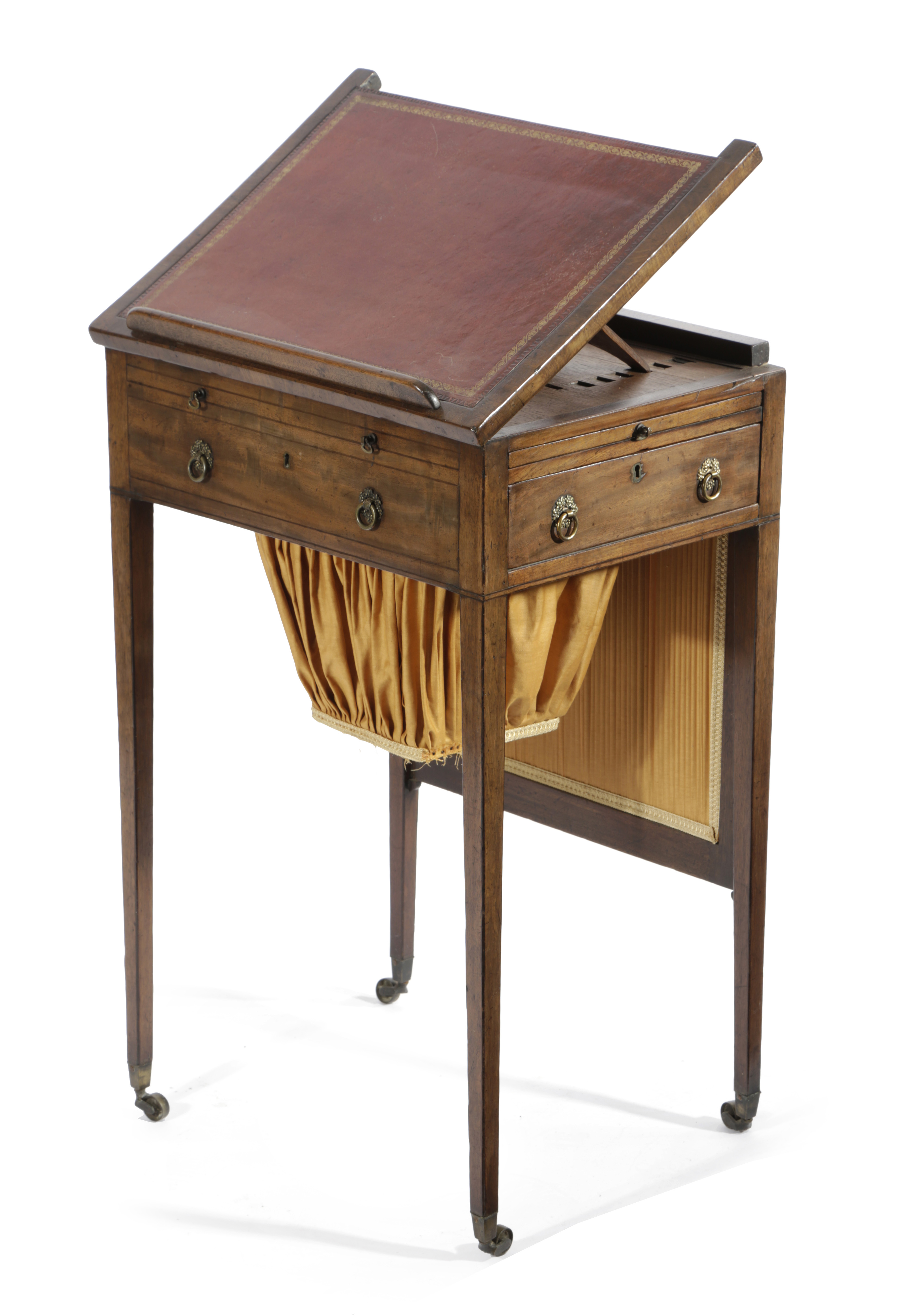 the hinged top on a ratchet with a later red leather surface and a rest, with a rising pleated silk screen, with slides to each side, a frieze drawer and a work bag, on brass castors