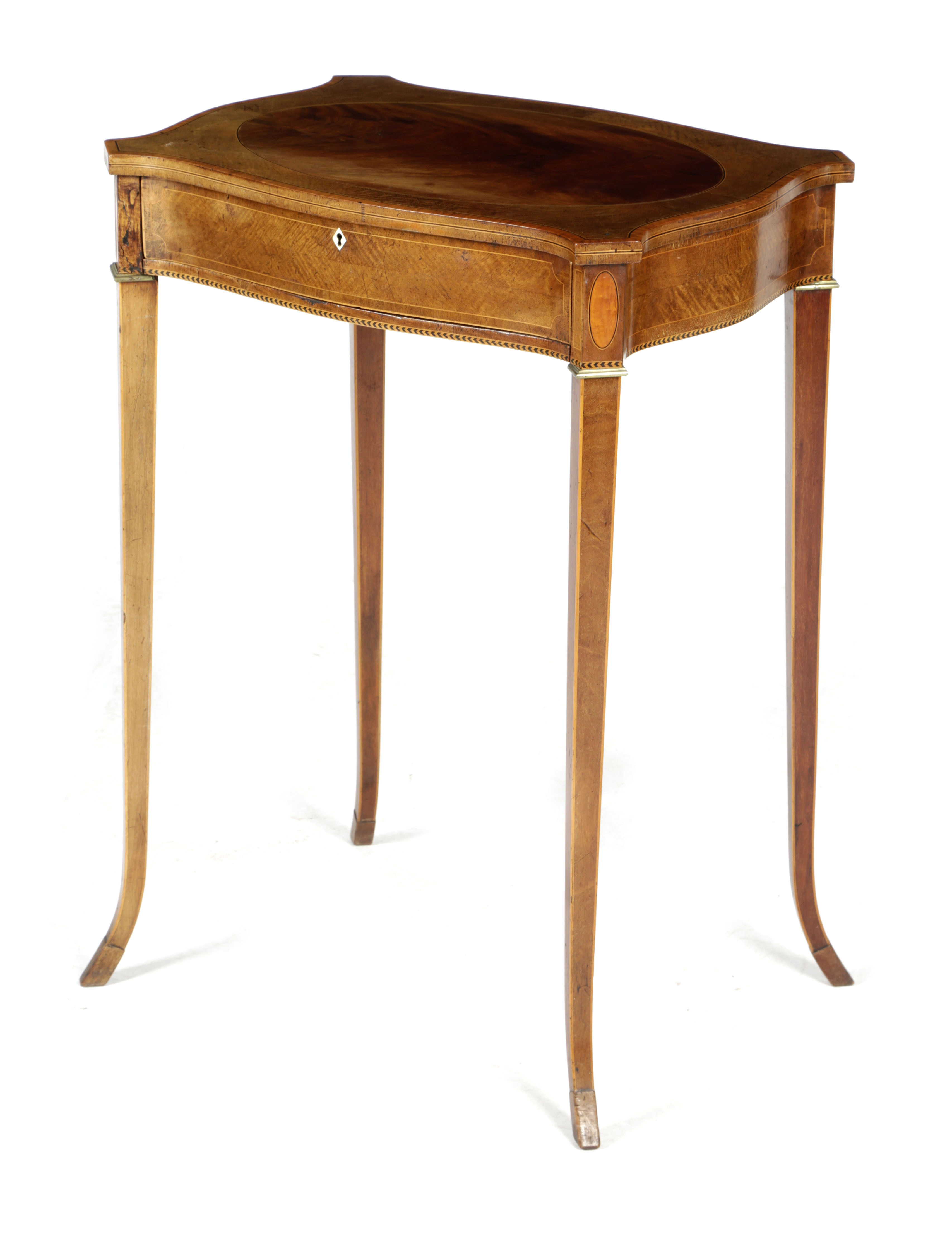 inlaid with stringing and satinwood banding, the serpentine top inset with an oval flame mahogany panel, above a frieze drawer, originally with divisions and a bag slide, on splay legs and moulded feet