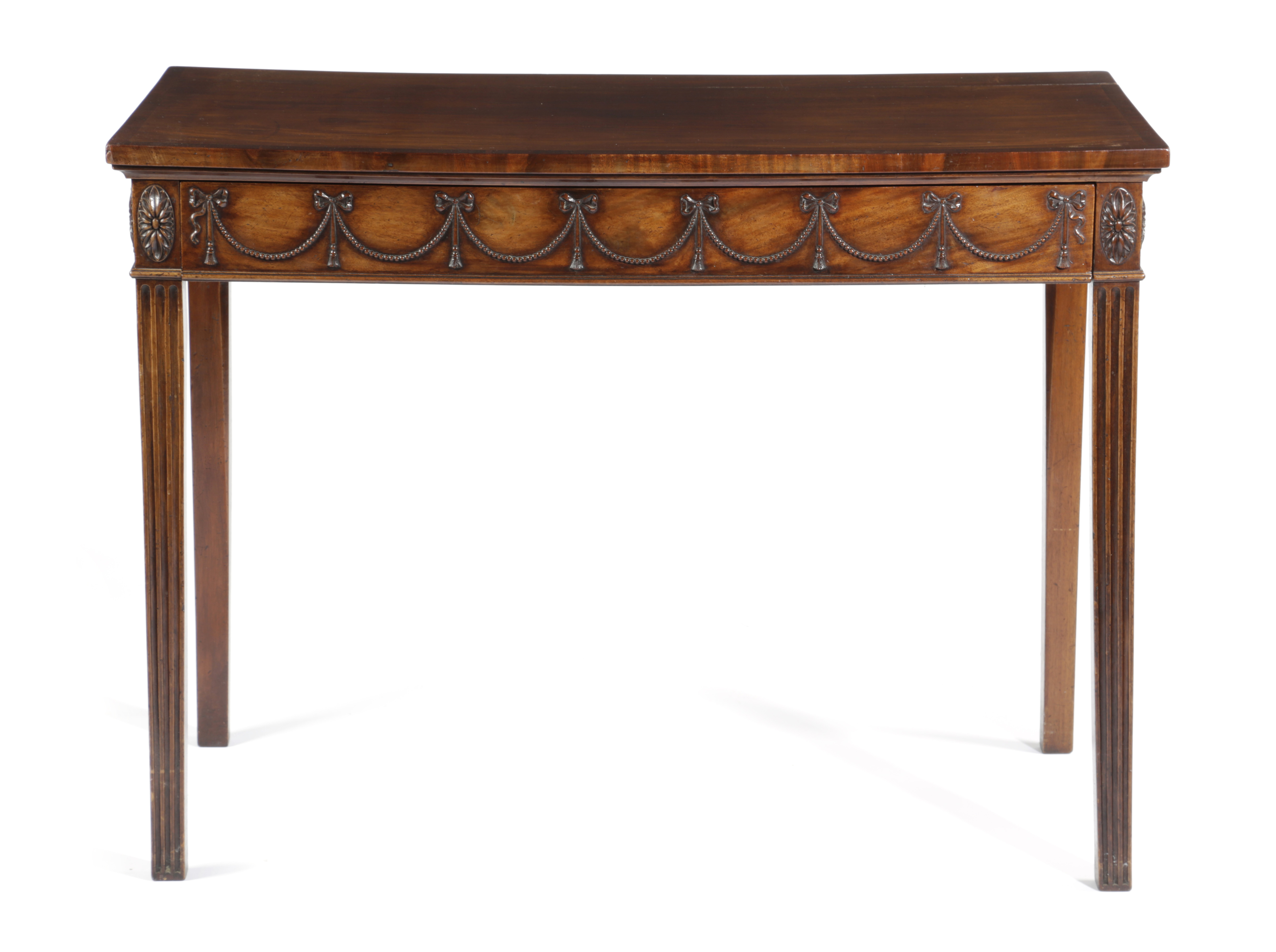 the crossbanded top above a frieze drawer, with applied ribbon and tassel bead swags and oval paterae on fluted legs