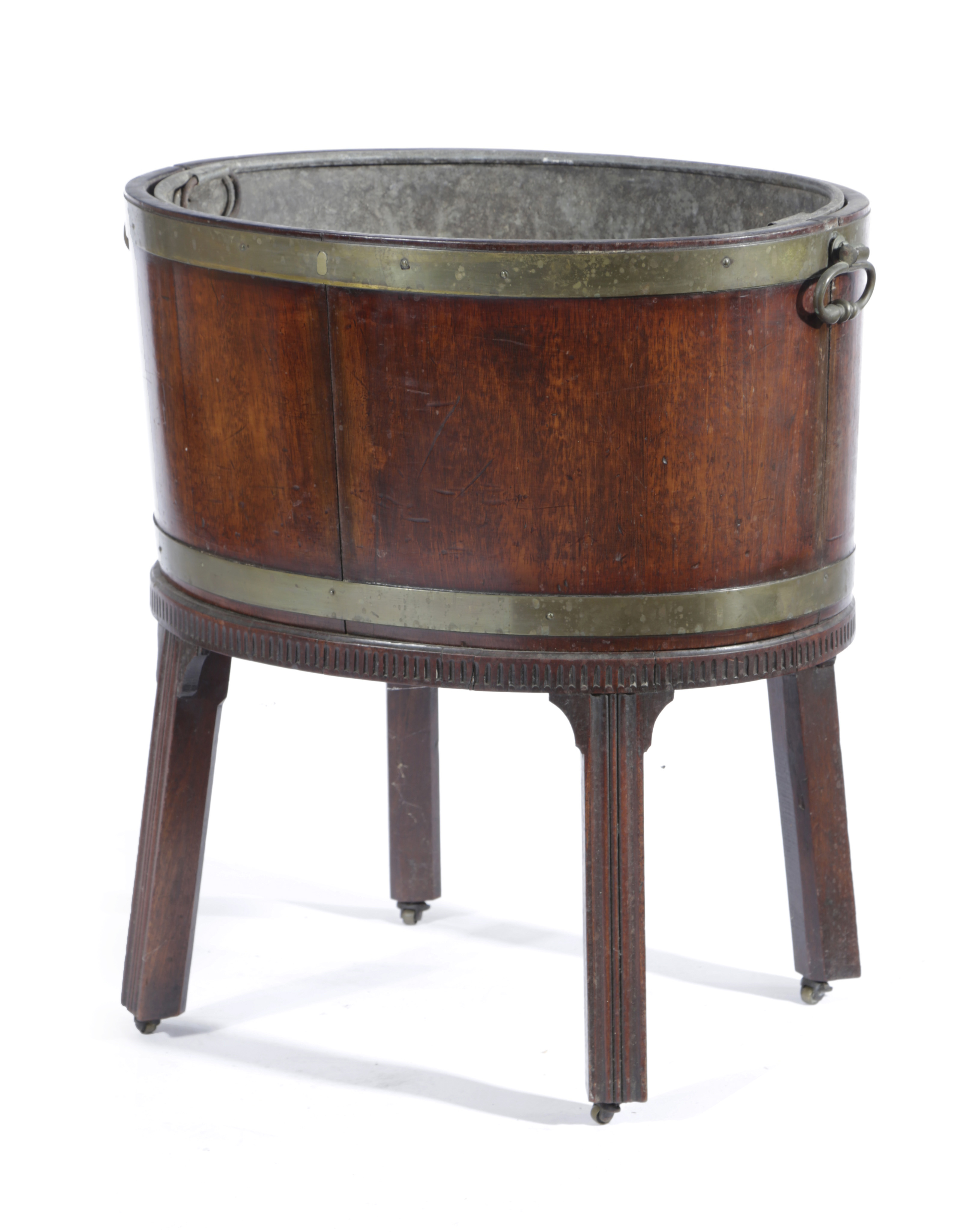brass bound with swing handles, a lift-out liner and on a fluted stand with moulded, bracketed legs and roller castors