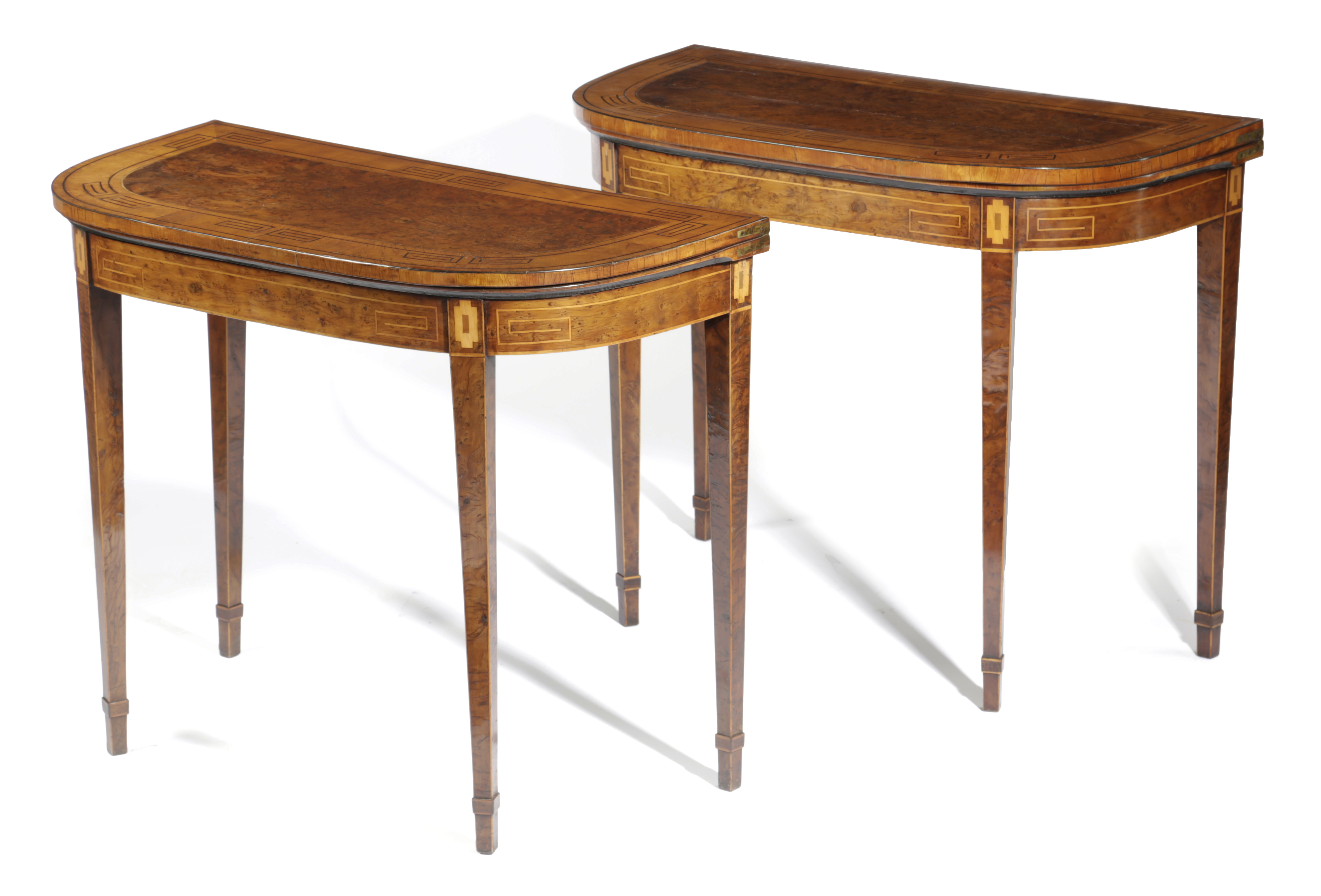 inlaid with ebonised and boxwood stringing with stylised Greek key designs, each with a 'D' shaped top with satinwood crossbanding and revealing a baize lined playing surface, on twin gate supports and square tapering legs with applied ankles (2)