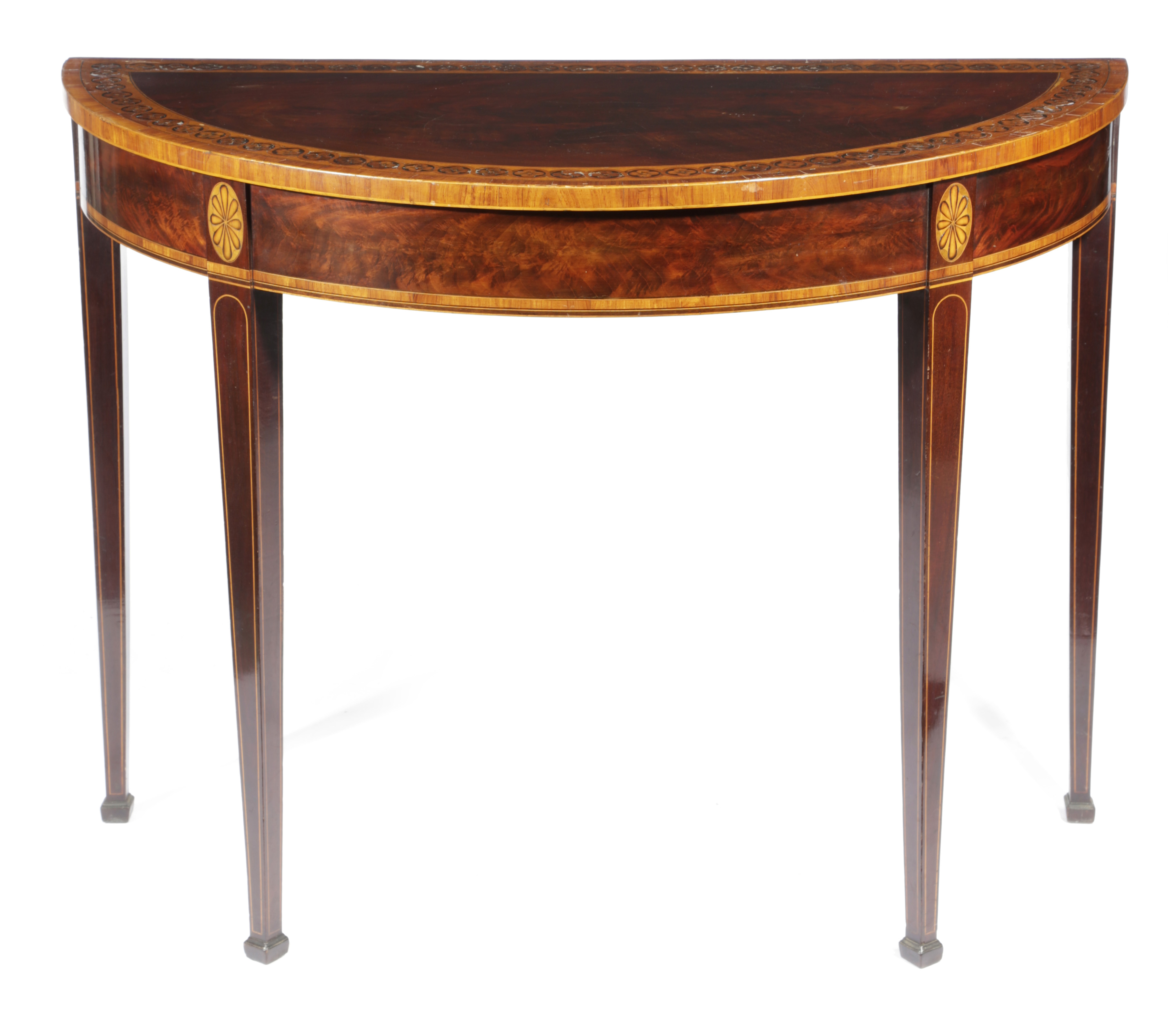 A GEORGE III MAHOGANY AND SATINWOOD DEMI-LUNE CONSOLE TABLE
