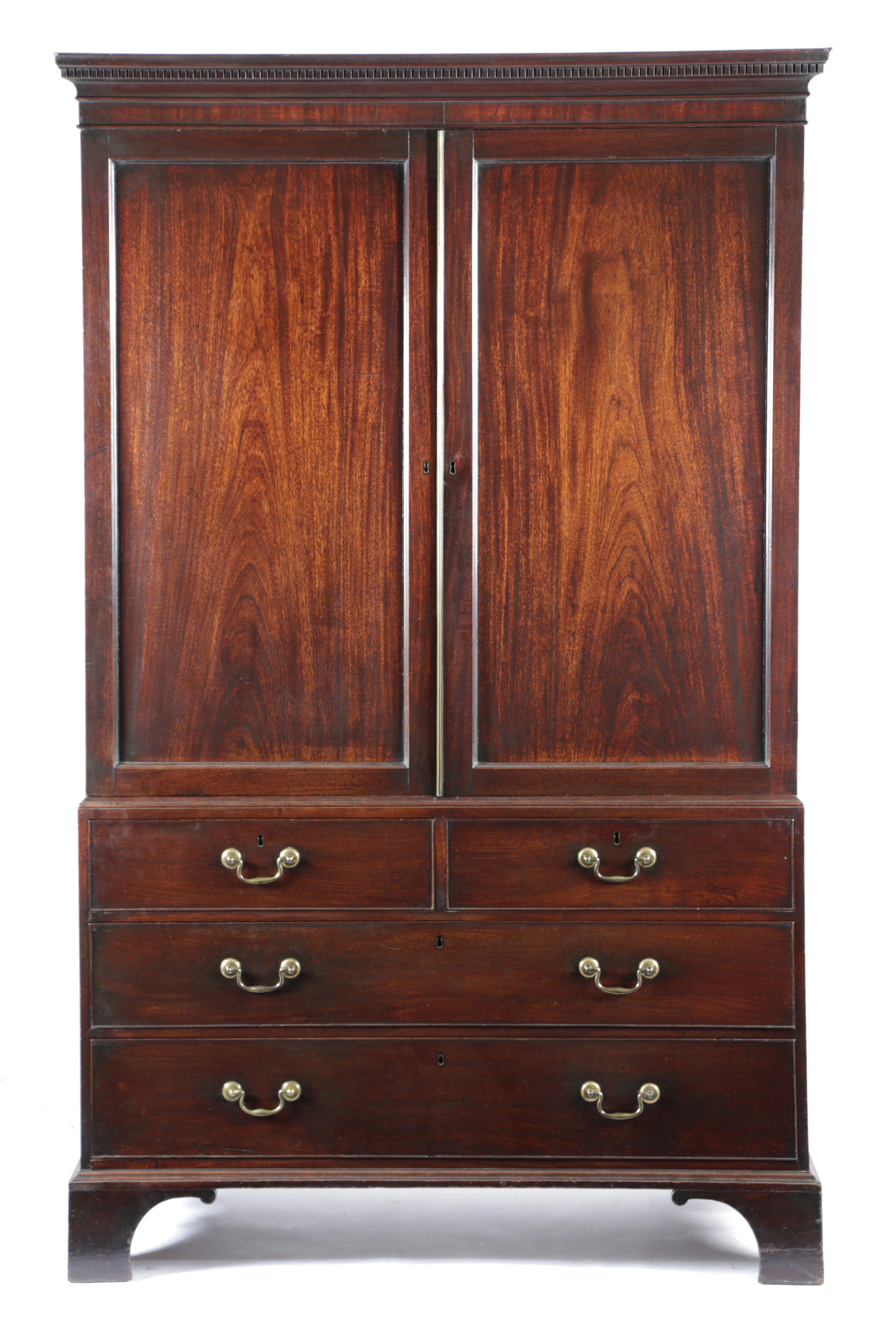 AN EARLY GEORGE III MAHOGANY LINEN PRESS