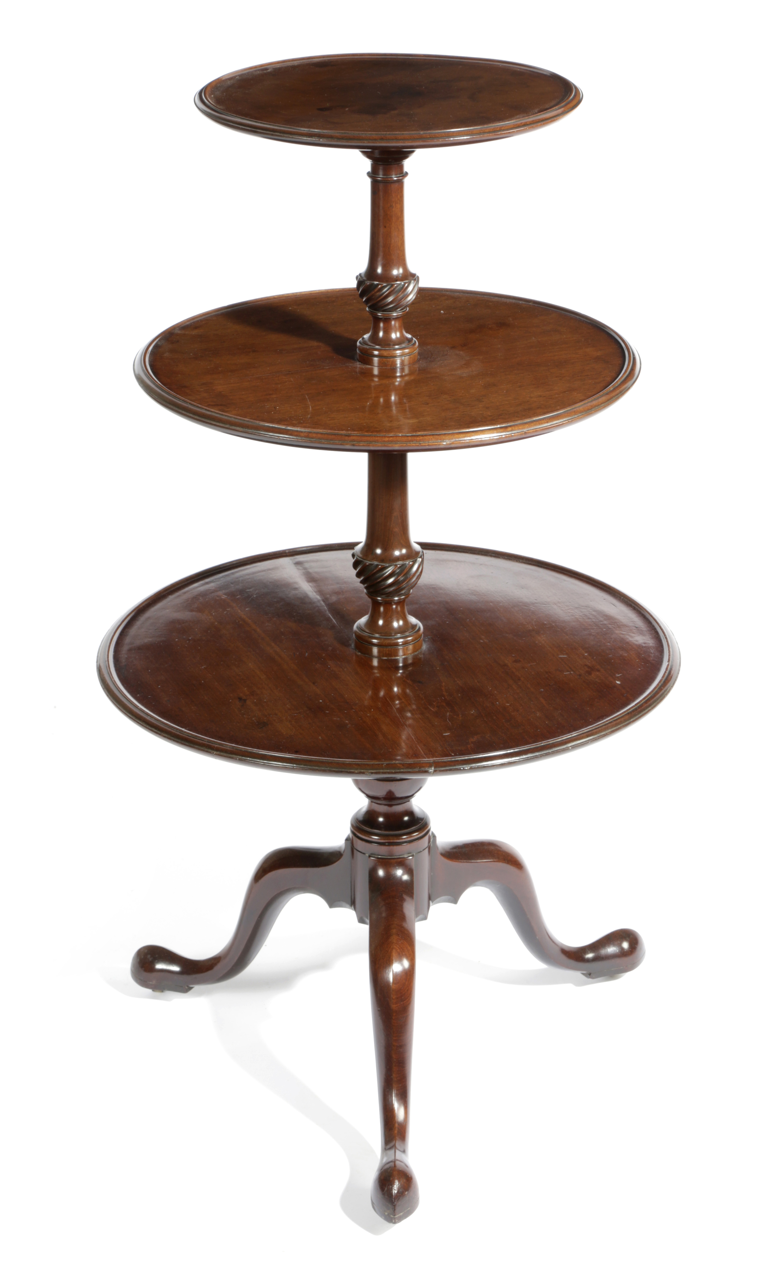 with three revolving graduated dished tiers, with a turned baluster stem with fluted bowls, on cabriole legs and brass roller castors
