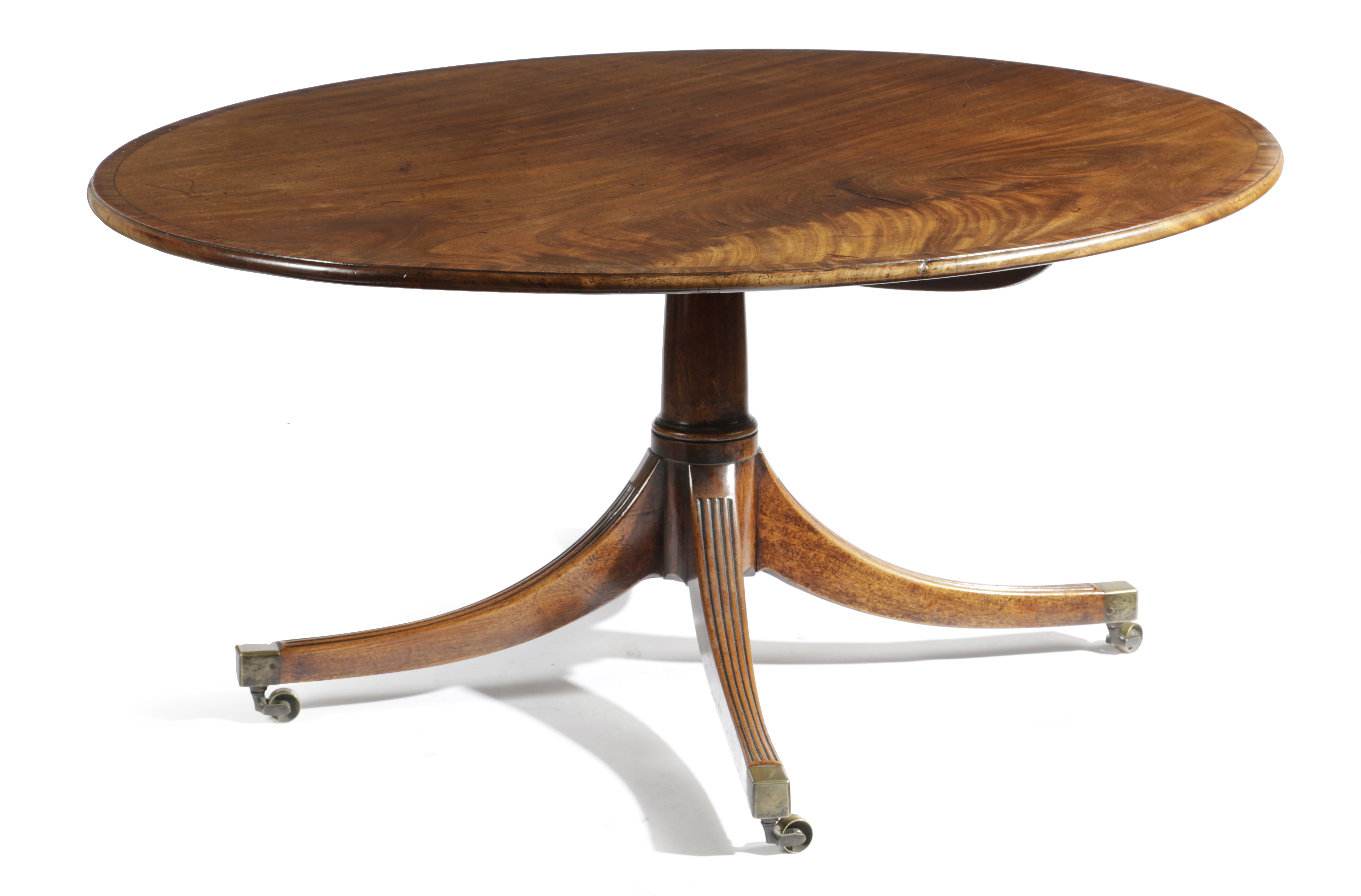 with an exceptionally large single-piece oval tilt-top with kingwood crossbanding, on a turned stem and four reeded splay legs and brass castors