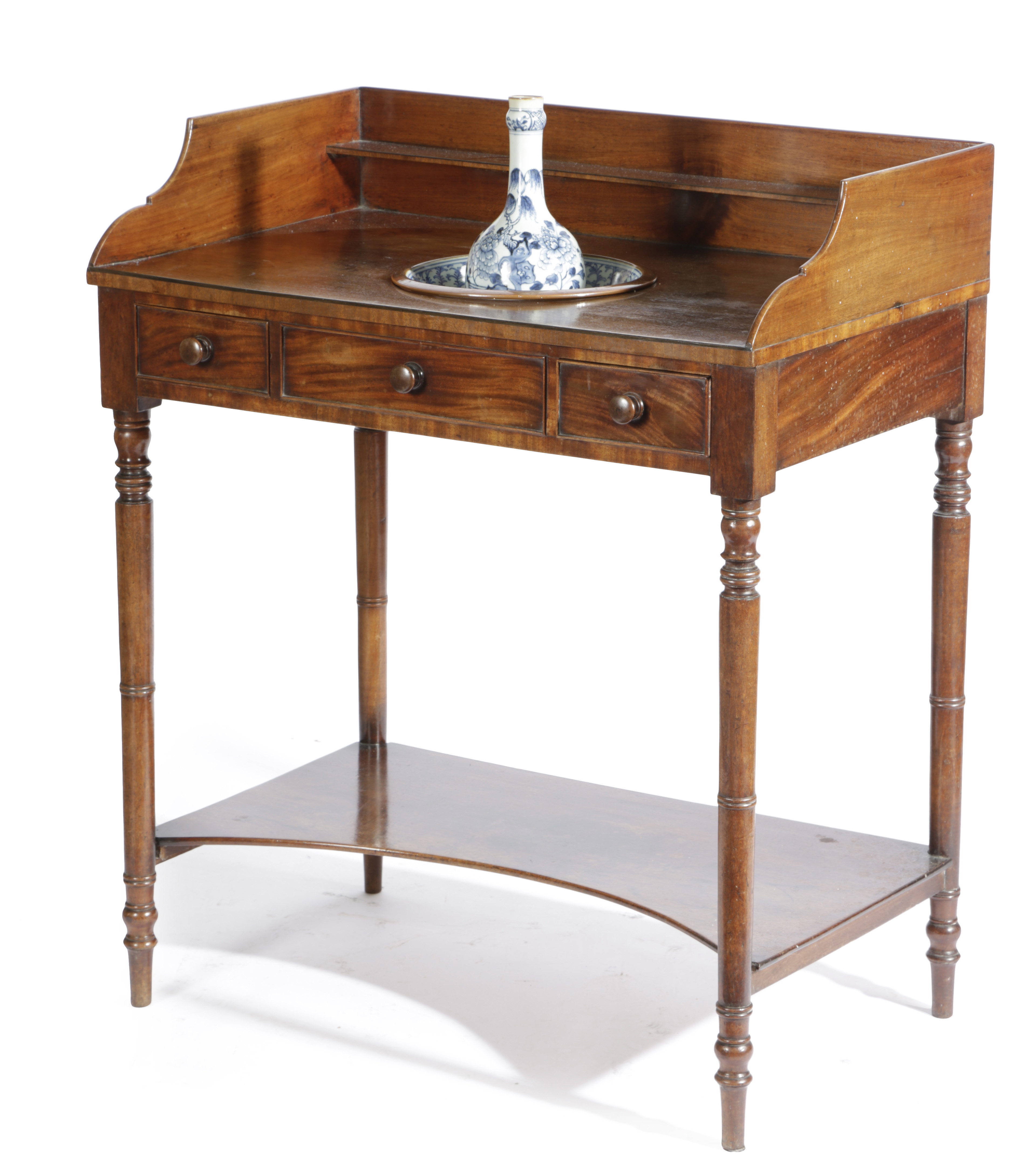 the top pierced with an aperture for a bowl above a pair of frieze drawers on turned legs, together with a Chinese porcelain guglet and bowl
