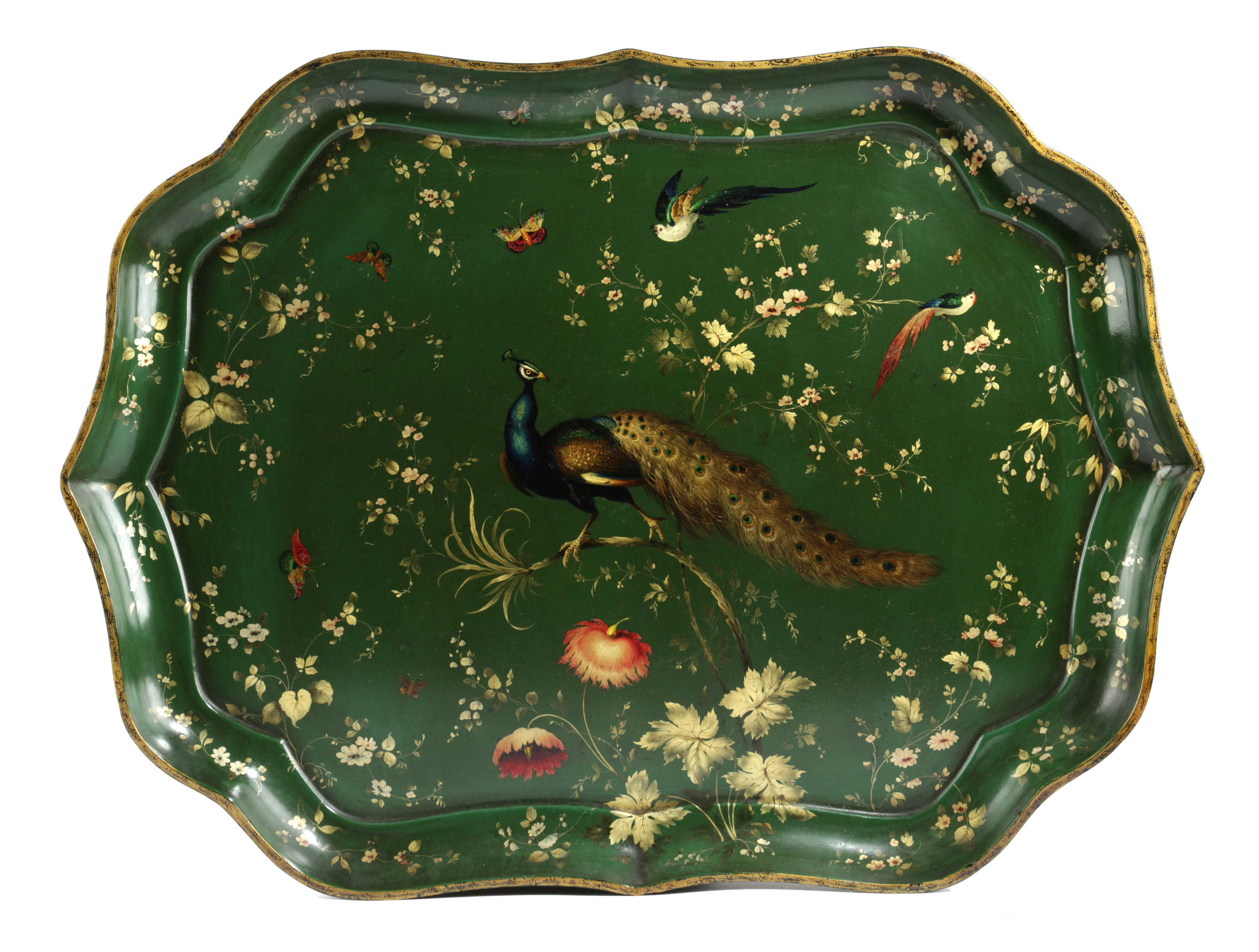 of serpentine outline, painted and gilded with a peacock and other exotic birds amongst flowering foliage on a green ground, painted inscription verso