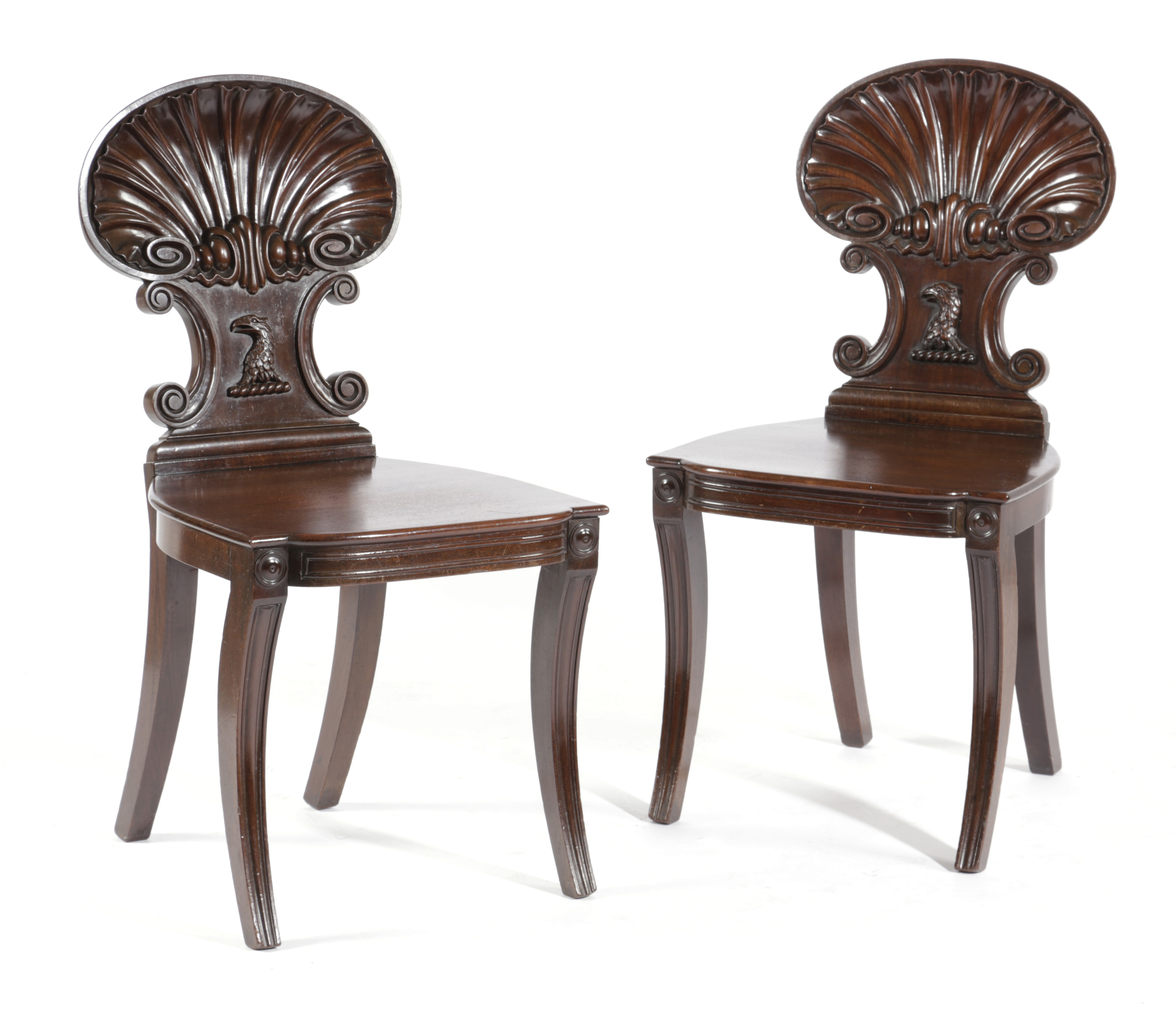 A PAIR OF REGENCY MAHOGANY HALL CHAIRS