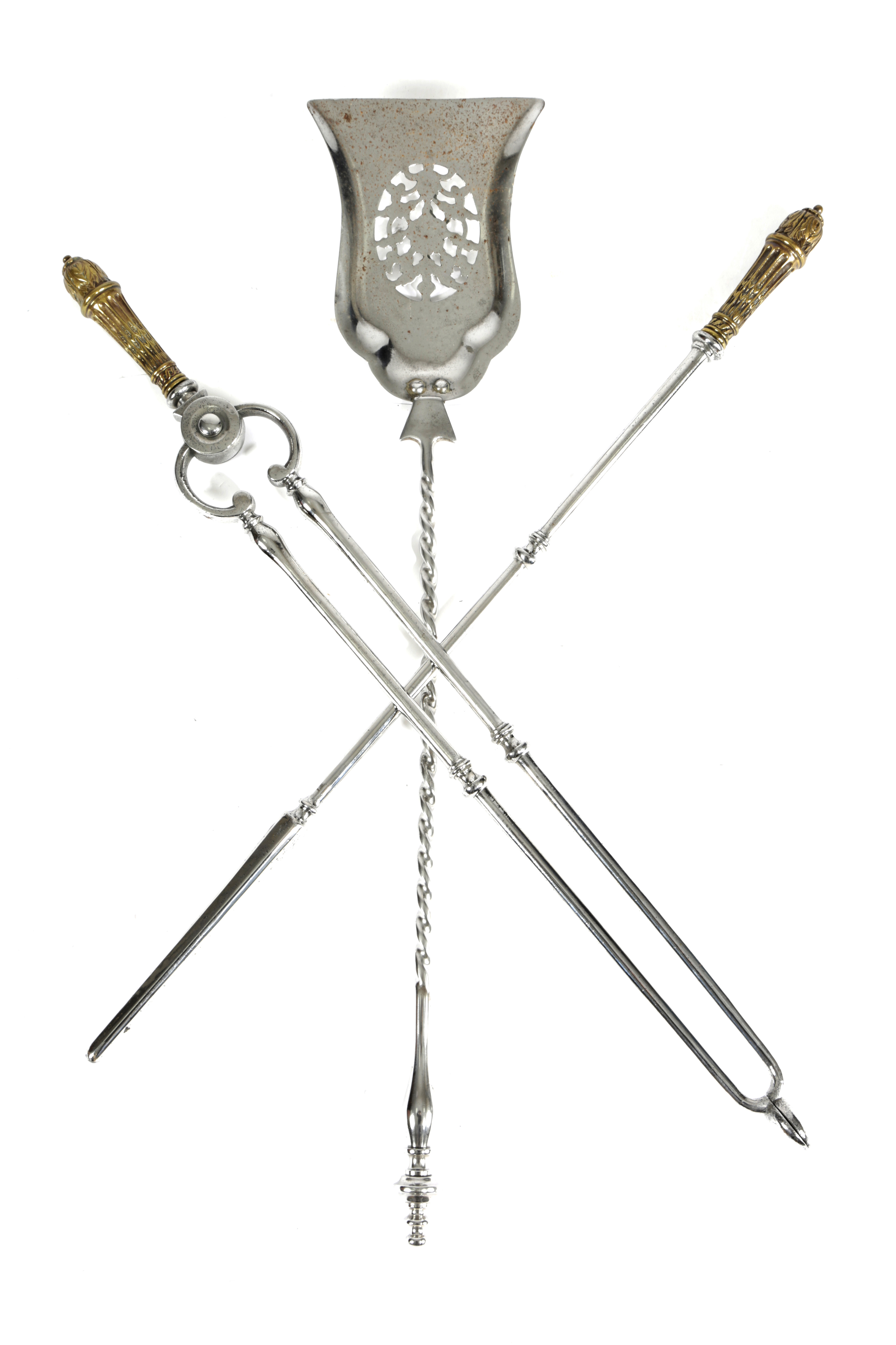 comprising a pair of tongs and a poker; together with a similar shovel with a pierced blade and barley twist shaft (3)