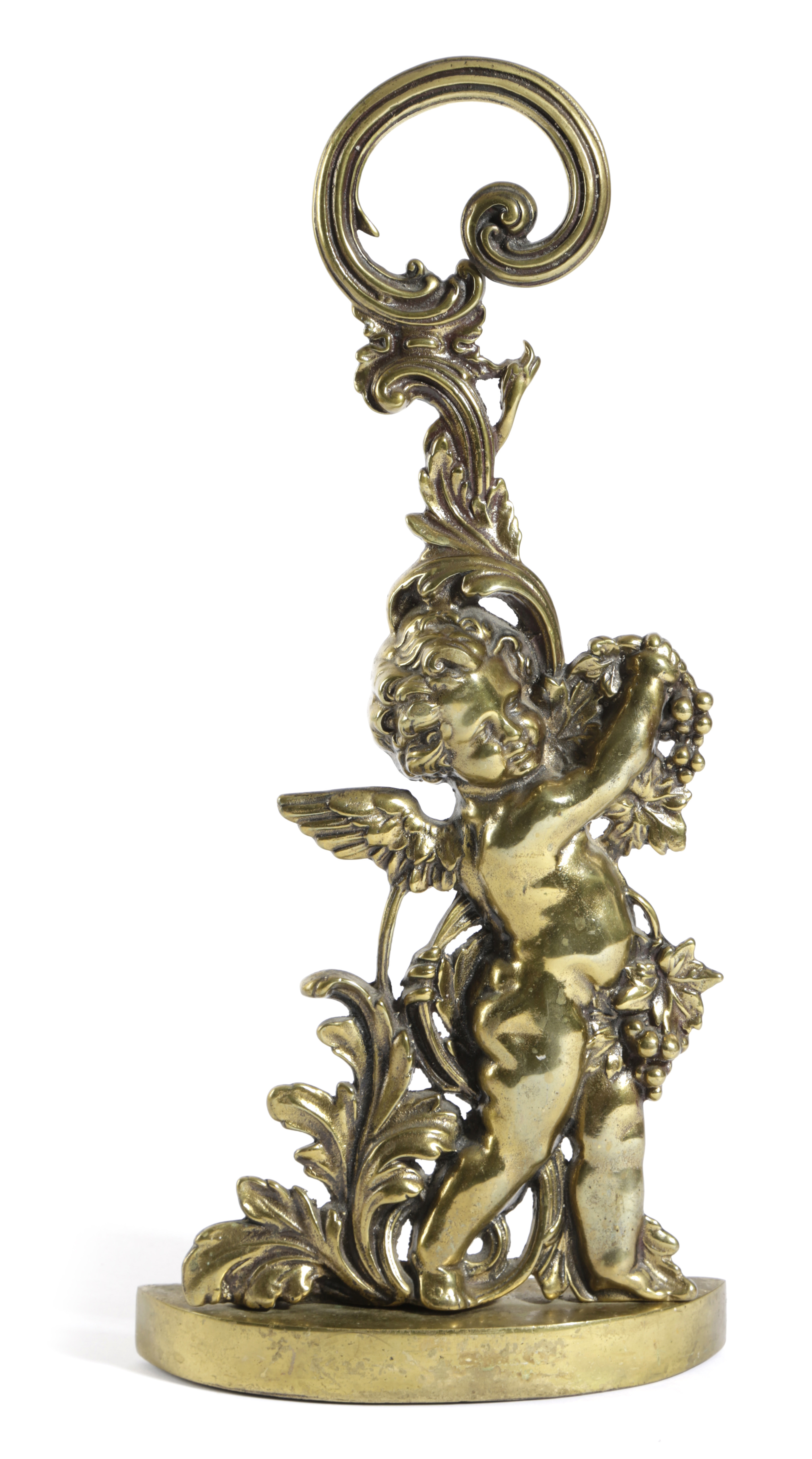 the leaf scroll handle above a winged putto holding a grapevine, the cast iron weighted base stamped 'Peerage England 4570'