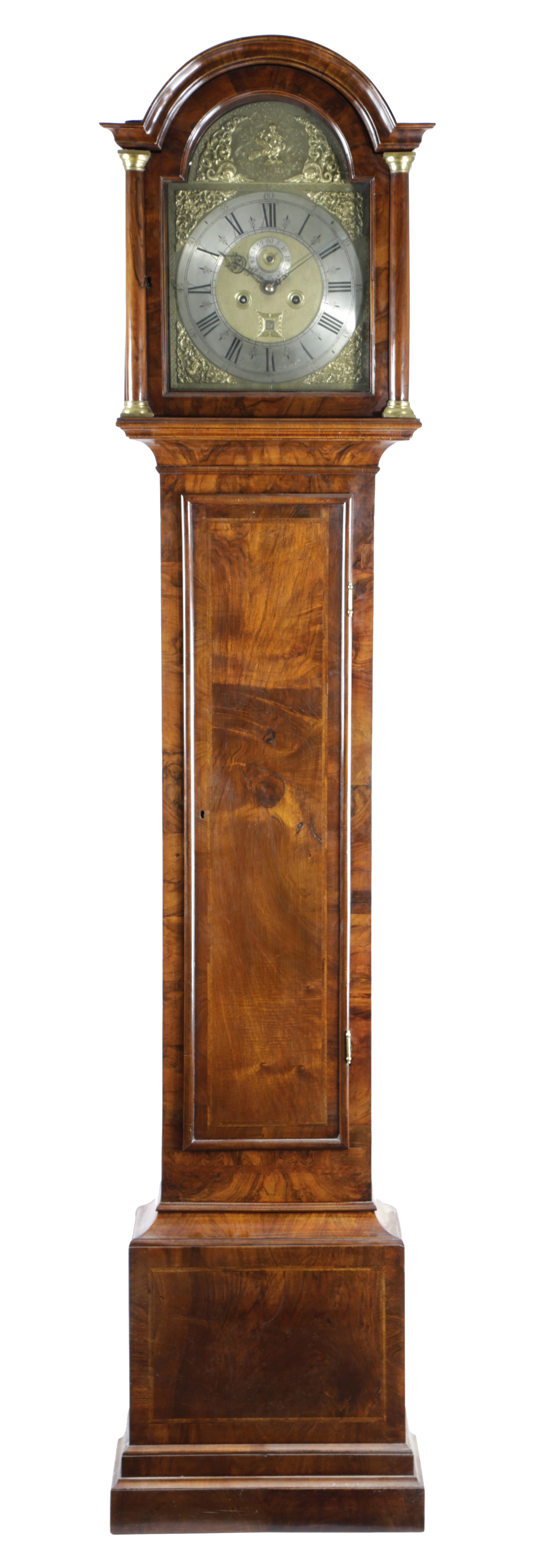 the brass eight day movement with three turned pillars and an anchor escapement striking on a bell, the brass 12 inch arched dial with a silvered chapter ring with Roman and Arabic numerals, the matted centre with a subsidiary seconds dial and date aperture, with finely cast mask and foliage spandrels, the arch engraved with flowers and leaves with cast dolphins flanking Jupiter riding an eagle, the case with cross and feather banding, with two brass cased weights, pendulum, case and winding keys