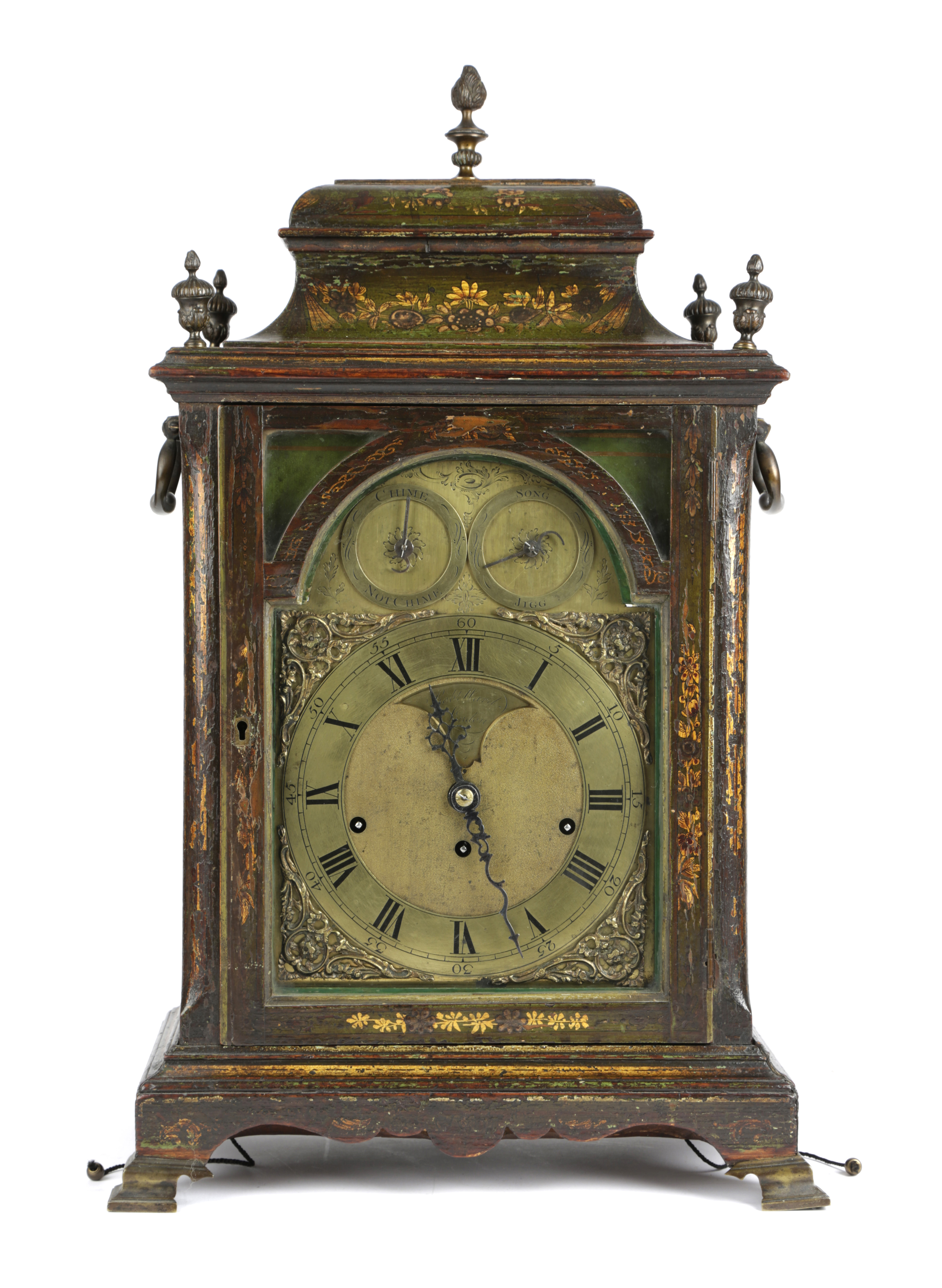 the brass twin fusee movement with a verge escapement striking on a single bell and chiming on a nest of eight bells, with twin repeat mechanisms for hours and minutes, a bob pendulum and scrolling foliate engraved backplate, the 7 1/2inch brass dial with a chapter ring with black Roman hours and Arabic five minutes, the matted centre engraved 'Robt'. Ward/London' inside scrolling foliate spandrels and beneath 'Chime Not Chime' and 'Song Jigg' dials to the arch, the case with a caddy top and gilt floral decoration, with twin carry handles, urn finials and arched glazed doors and side panels, on brass bracket feet
