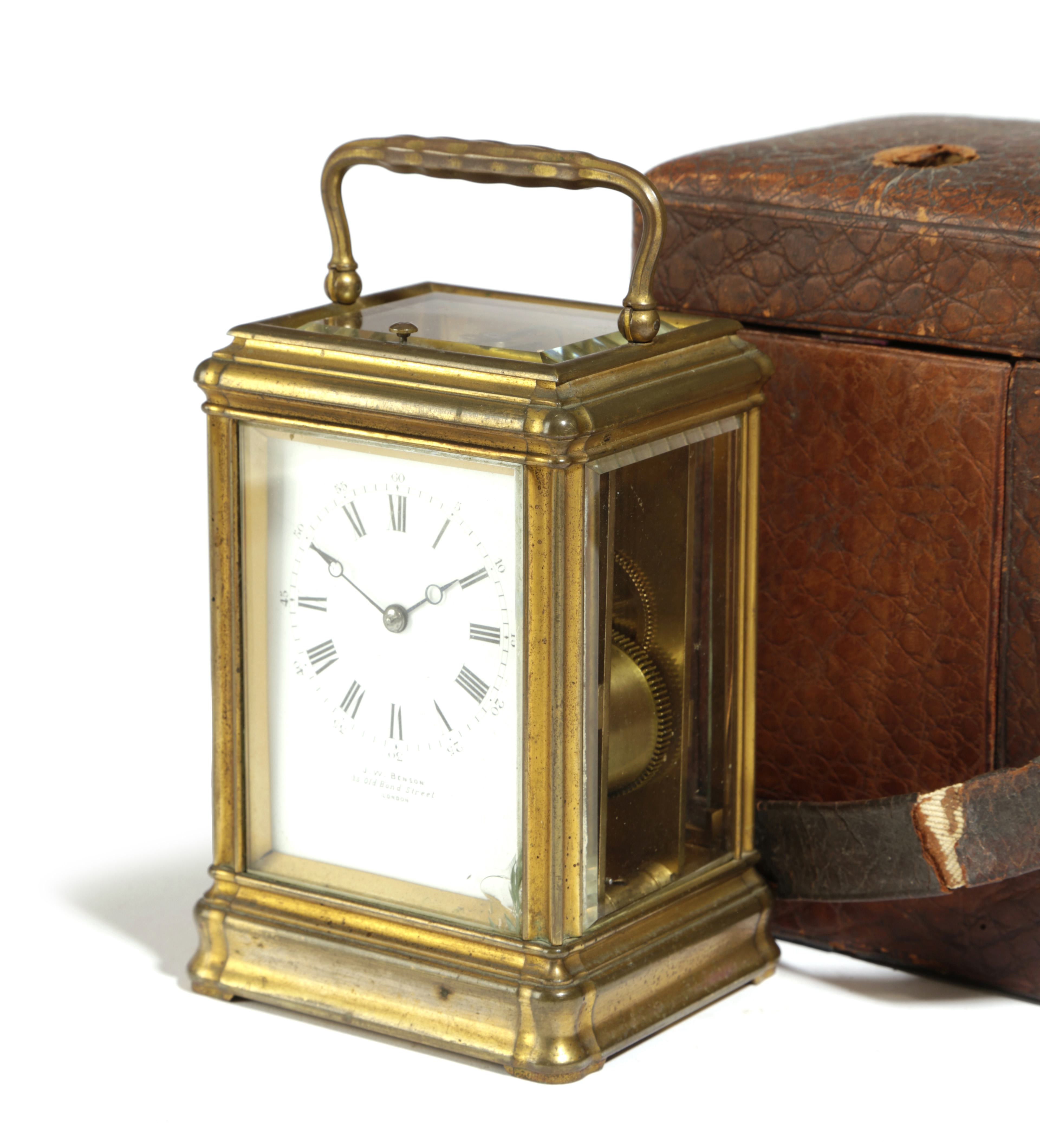 the brass eight day repeating movement striking the hours on a gong and stamped '23696', with a platform escapement, the enamelled dial with black Roman hours and Arabic five minutes, in a gorge case also stamped '23696', in its original leather lined carrying case, with key (2)
