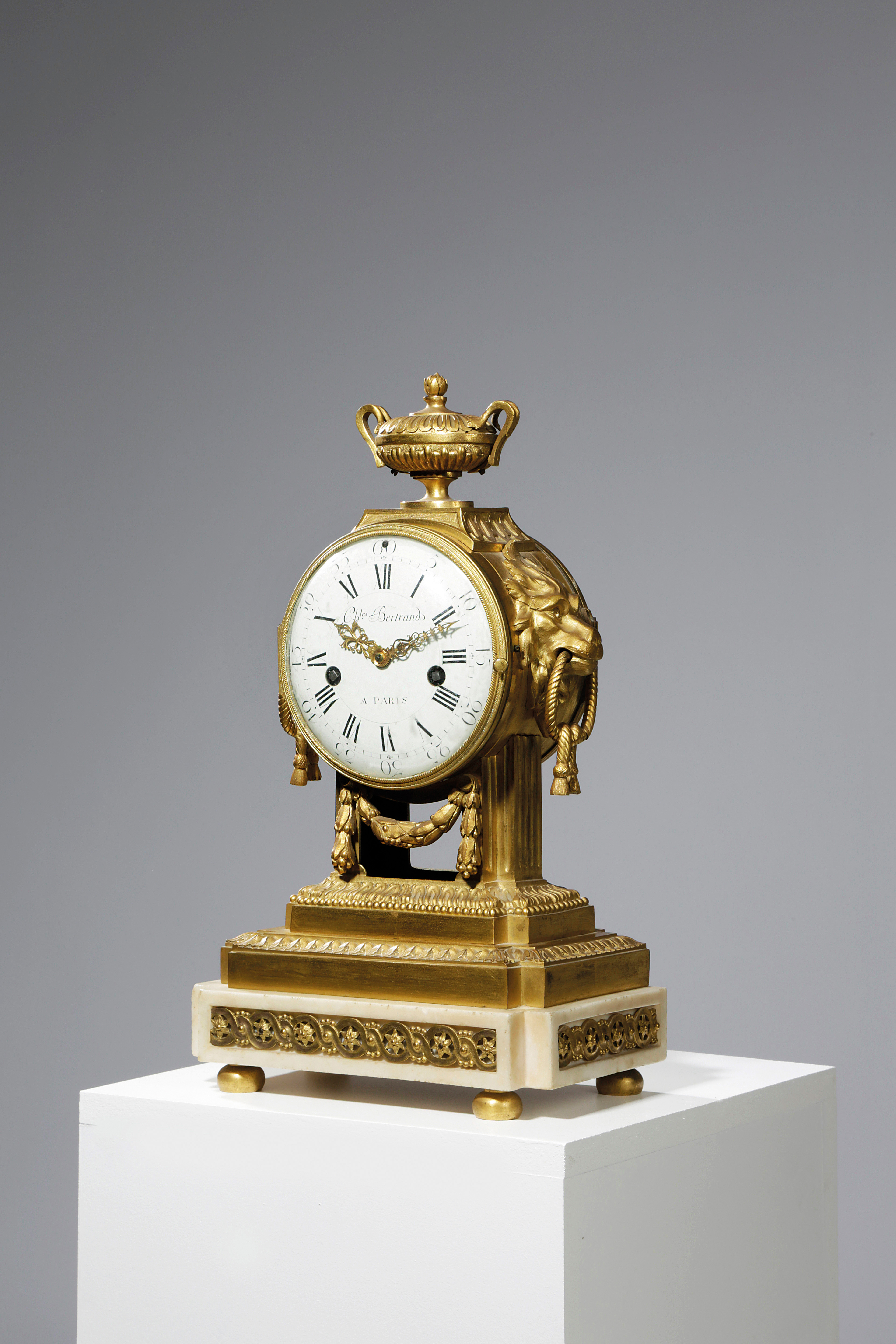 the brass eight day movement inscribed 'Chles Bertrand Paris', with an external countwheel striking on a bell, the domed, white enamel dial with black Roman hour and white Arabic five minute numerals inscribed 'Chles Bertrand/A PARIS', with pierced gilt metal hands, the cylindrical case surmounted by a fluted urn, flanked by a pair of lion heads holding knotted rope swing handles and above a fruiting laurel swag, on a shaped rectangular stepped base with bands of cast foliate and flowerhead decoration on bun type feet, with key