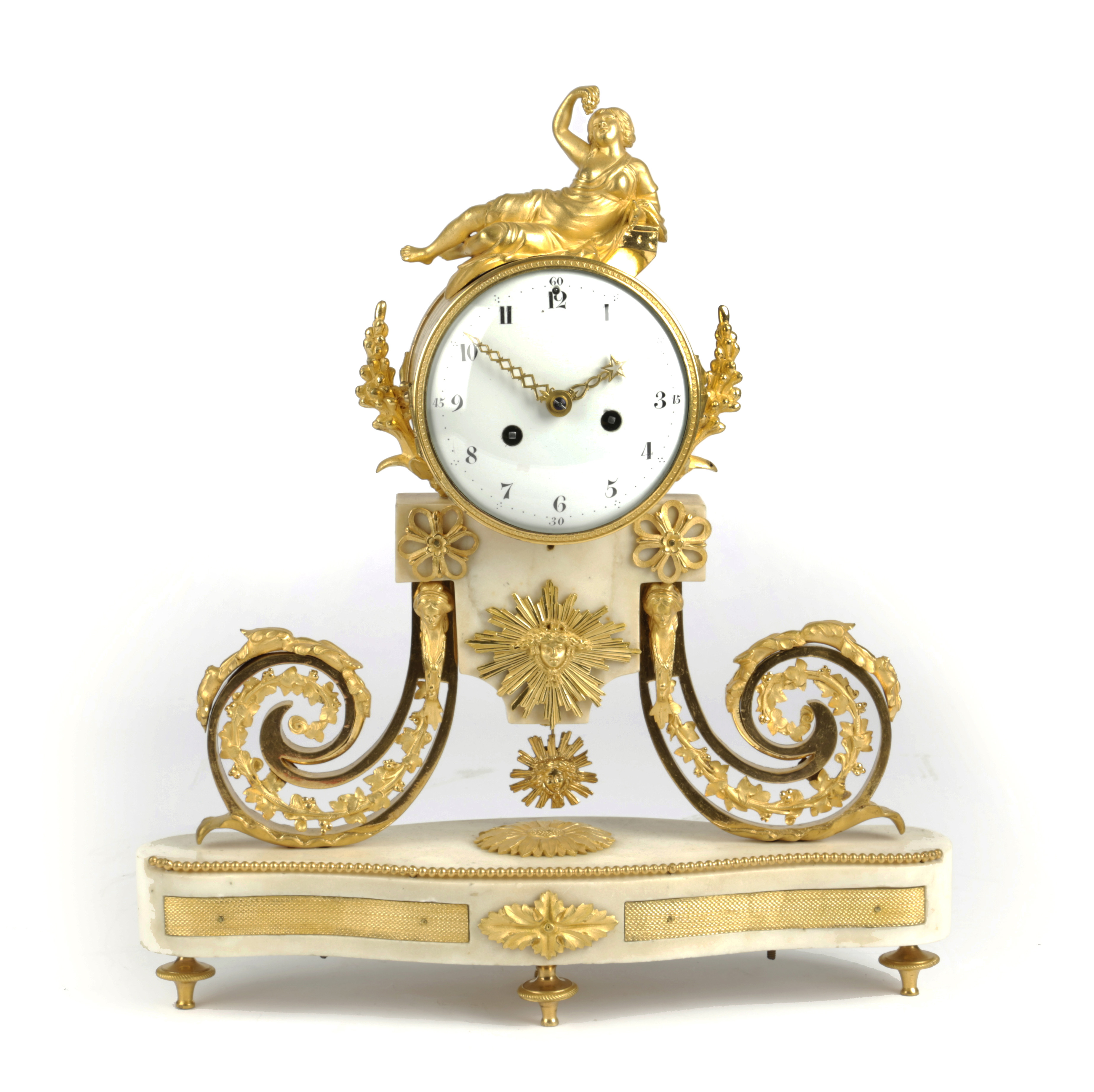 the brass eight day drum movement with an outside countwheel and sunburst pendulum, the enamelled dial with black Arabic hour and quarter numerals, the case surmounted by a maiden eating grapes above floral sprays, on a pair of scrolling supports flanking a sunburst, on a slender, serpentine white marble base with toupie feet, with two keys