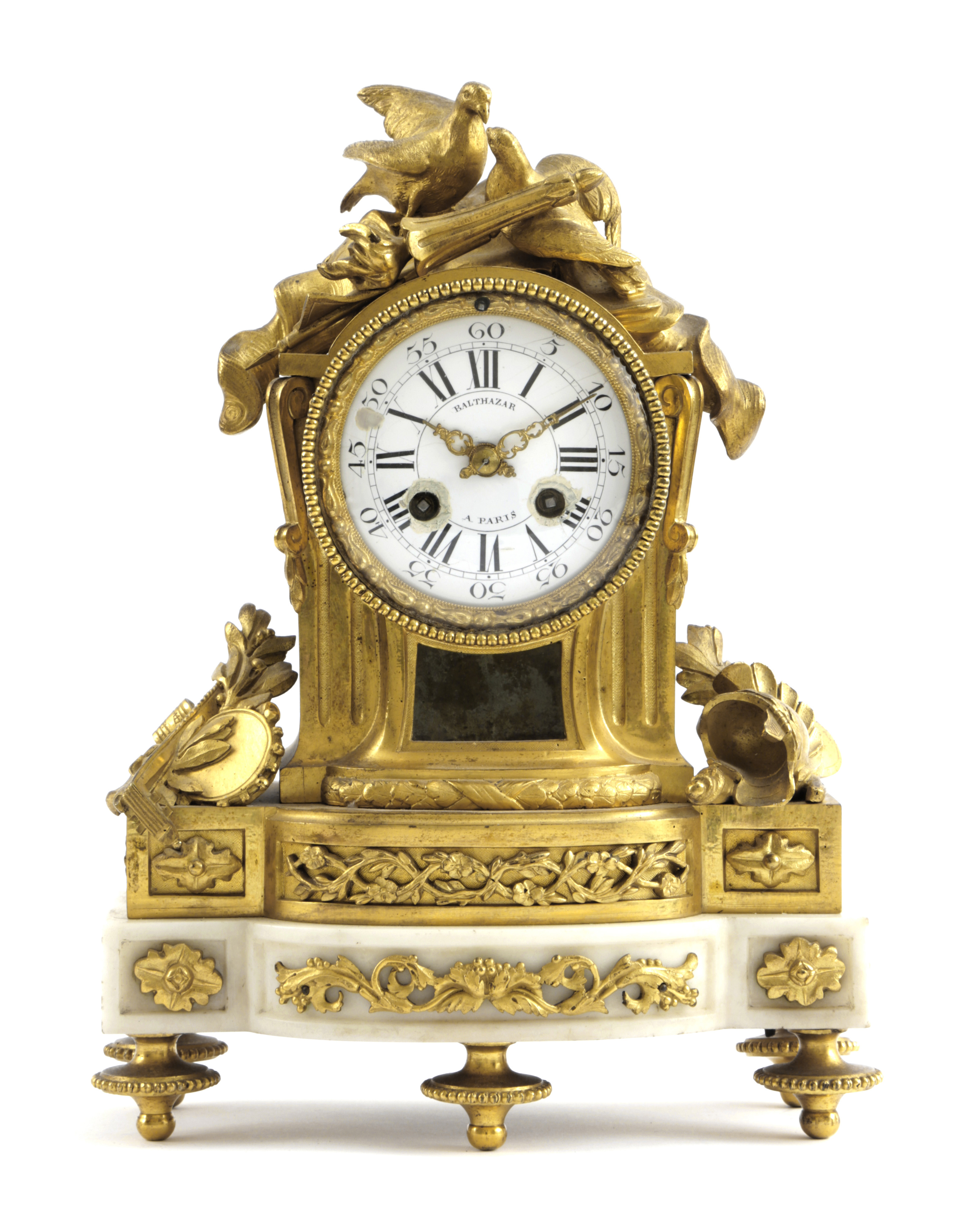 A FRENCH GILT METAL AND WHITE MARBLE MANTEL CLOCK