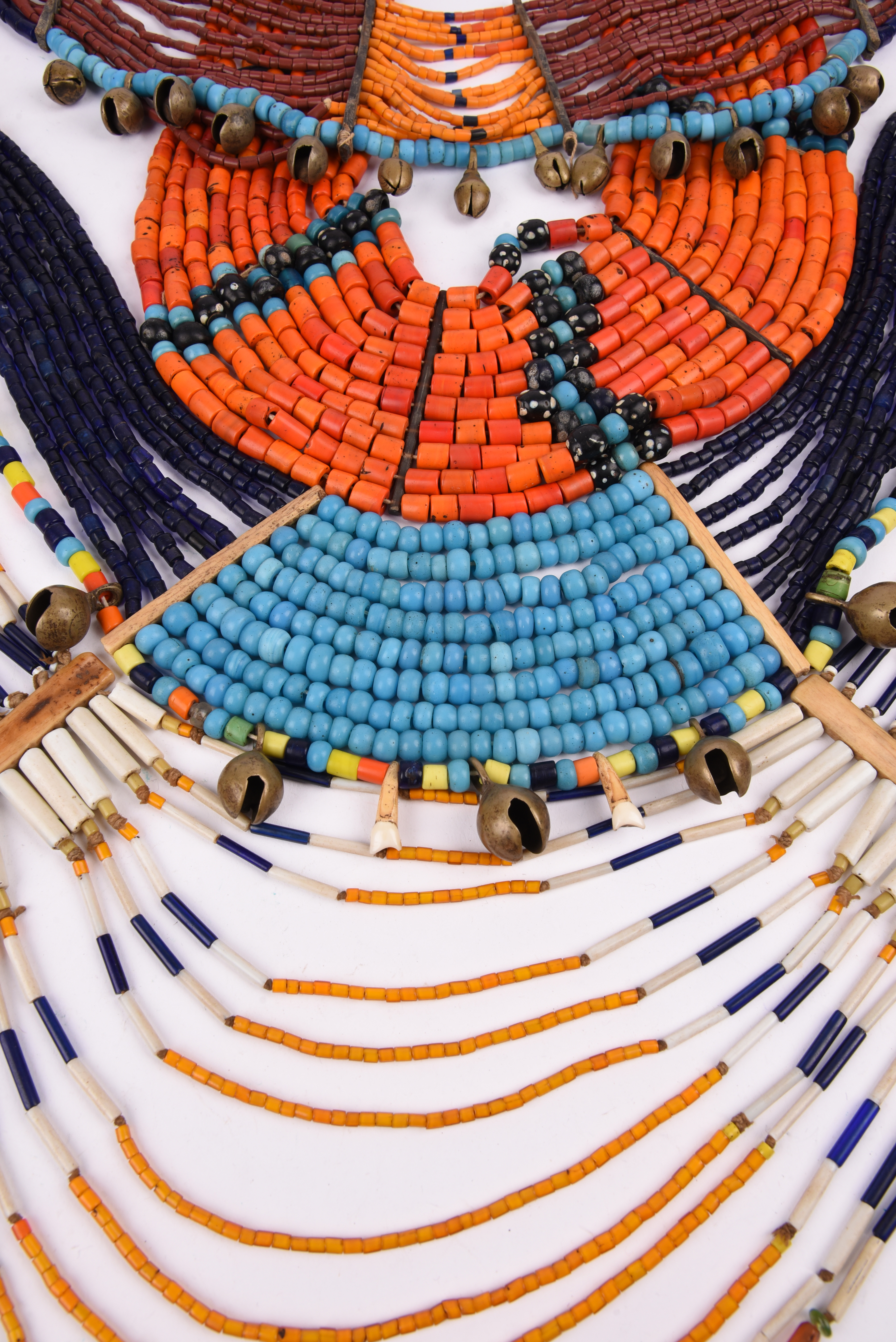 coloured and clear glass beads, bone spacers, two hung with brass bells with one having two dog teeth,