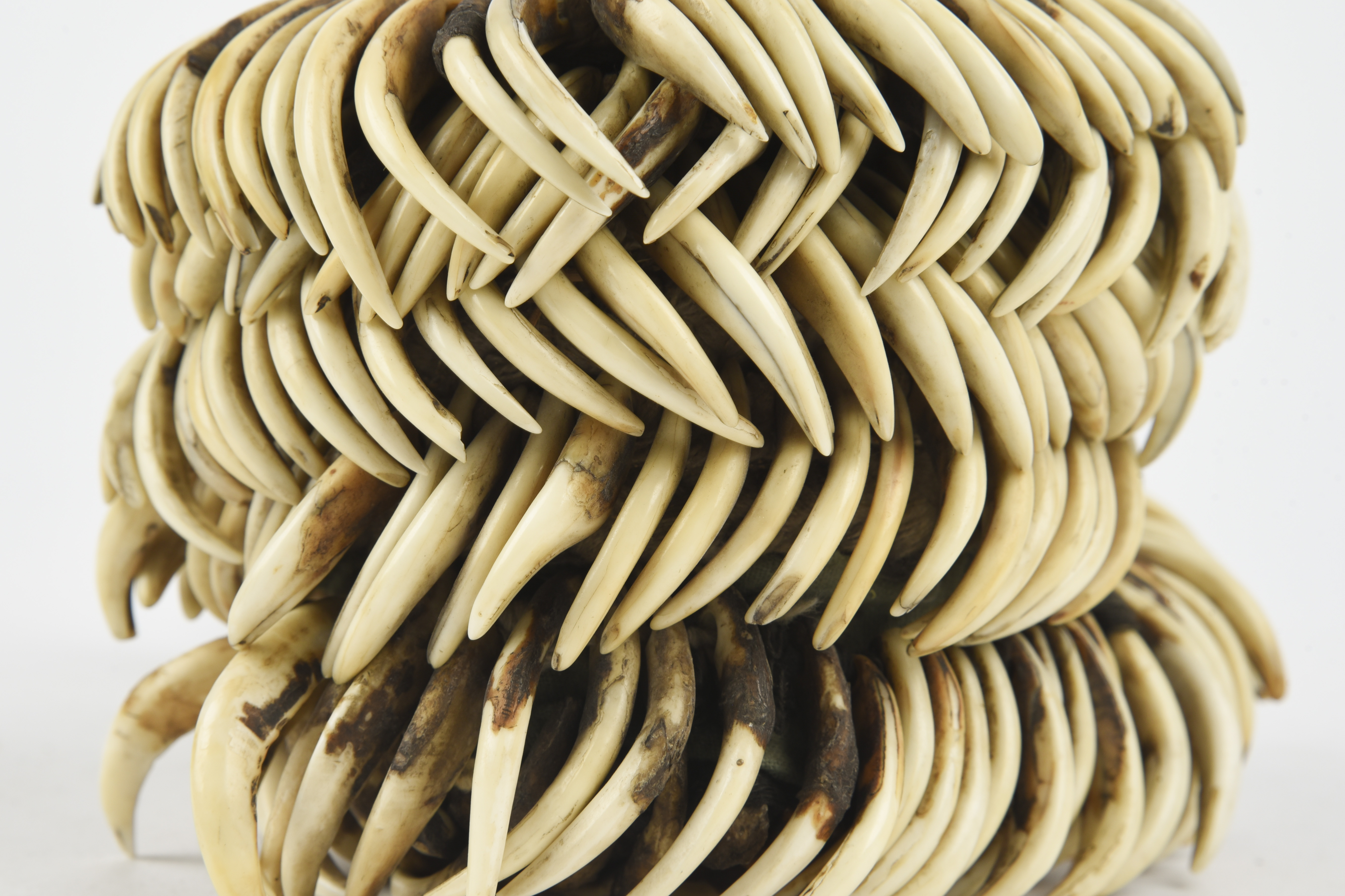 with six rows of pangolin claws manis crassicaudata on a woven fibre and cloth backing, with a metal ring threaded ten strand necklace and with shell and brass coil spacers,