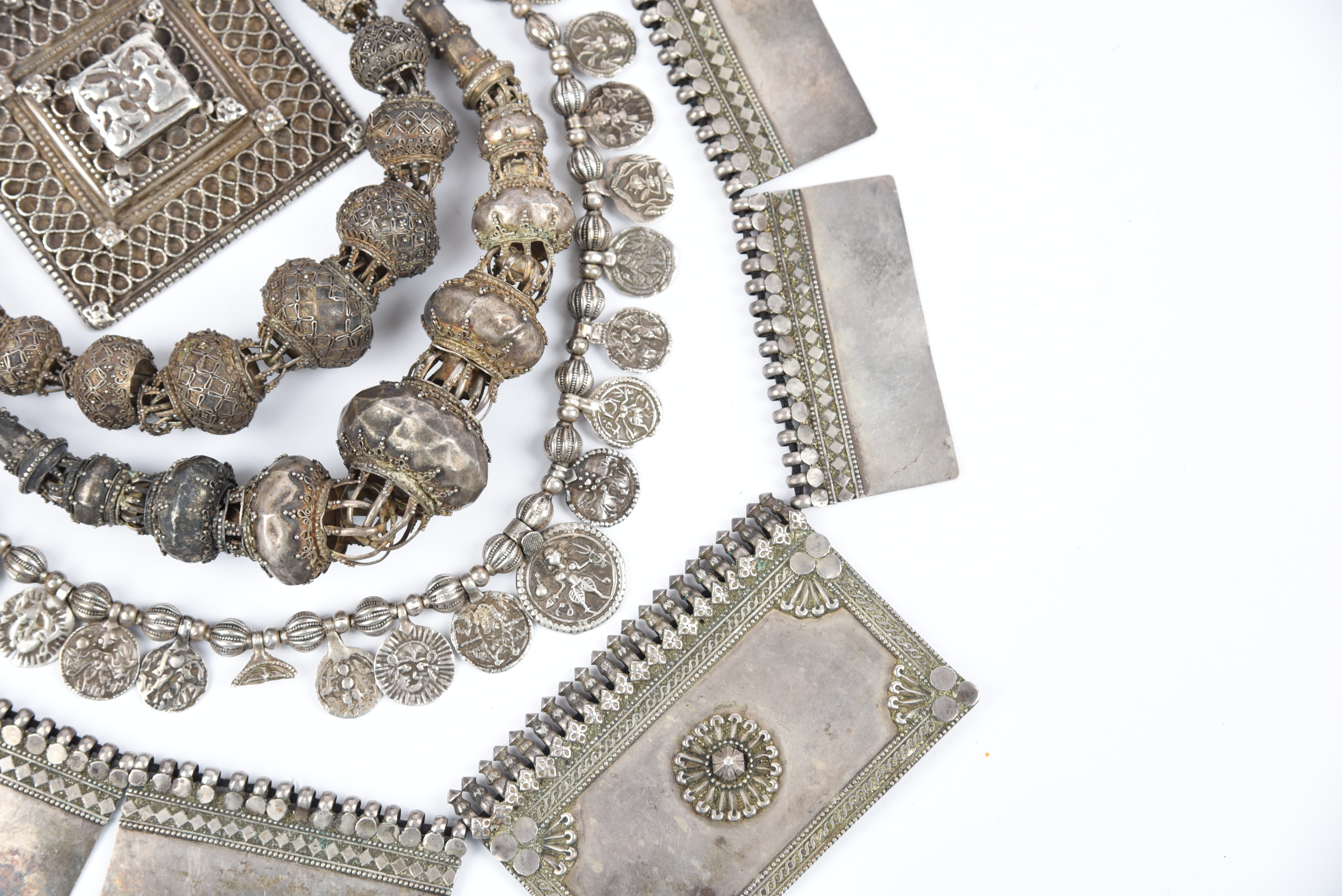 silver coloured metal; one with seven rectangular panels with applied band decoration, the central panel with a boss; one with ribbed beads and embossed disc pendants depicting deities and auspicious symbols; one with hexagonal amulets and a filigree clasp; two with interlaced beads, and one with an amulet with a raised panel depicting Ganesh and Lakshmi, 7cm wide. (6)