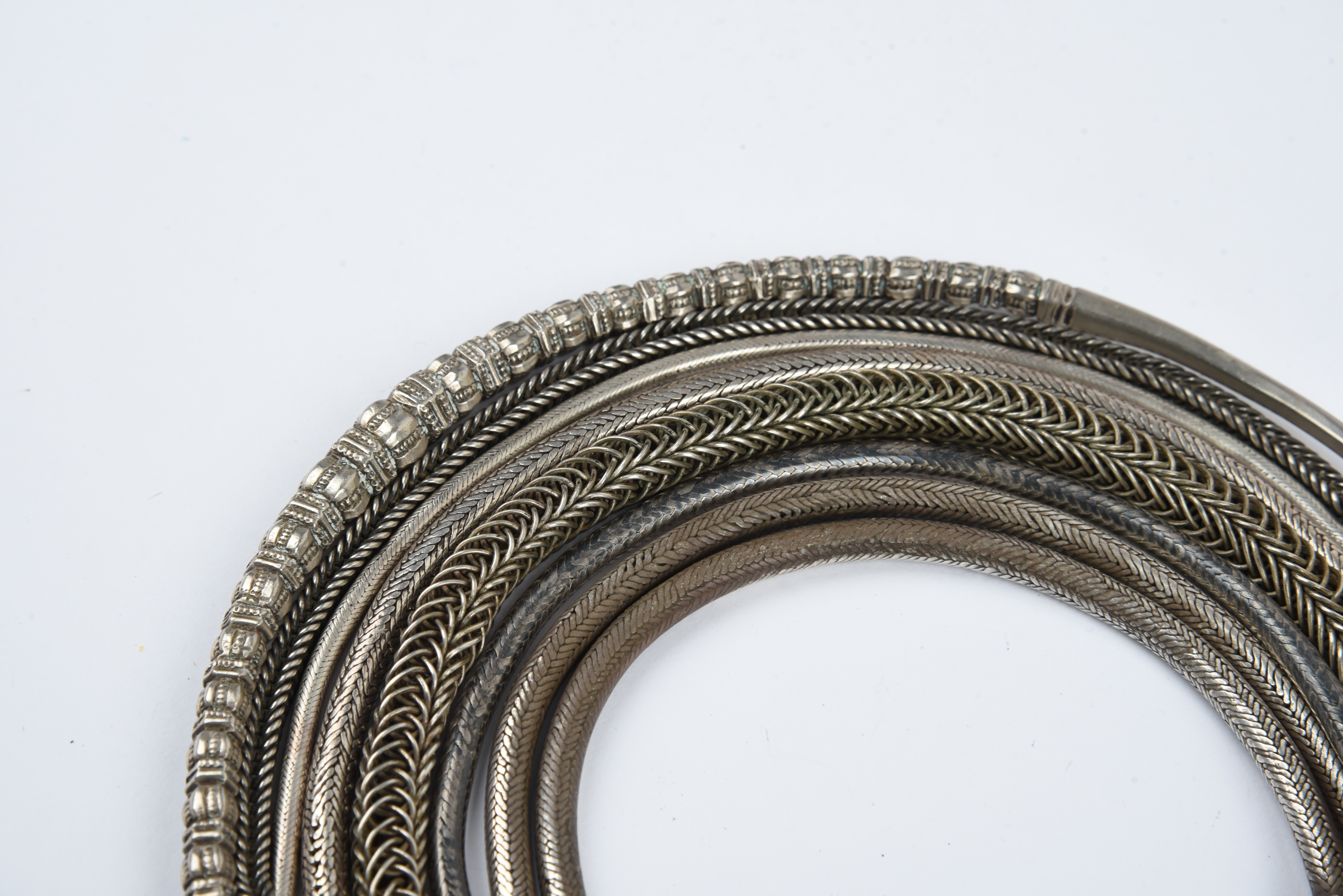 silver coloured metal, two with screw fastening clasps, one of which has barrel ends with applied flowerheads, one with an agate set pendant, the longest 75cm, and an Indian silver coloured metal torque, 16.6cm wide. (8)