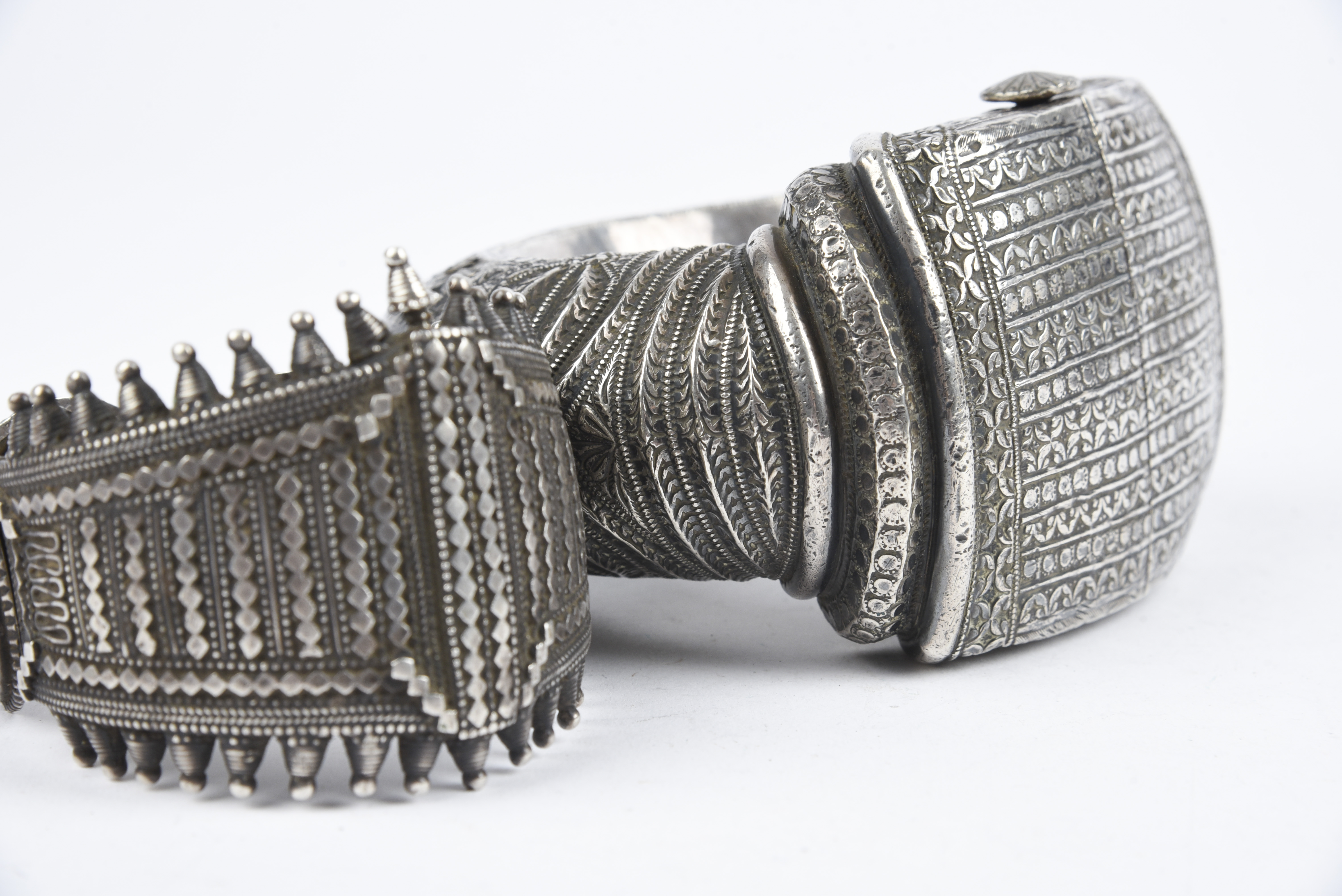 and two Indian silver coloured metal bracelets, one plain with ribbed knops, 9.5cm wide and the other with lozenges and conical edging with a mesh band and three discs, 8cm wide. (4)