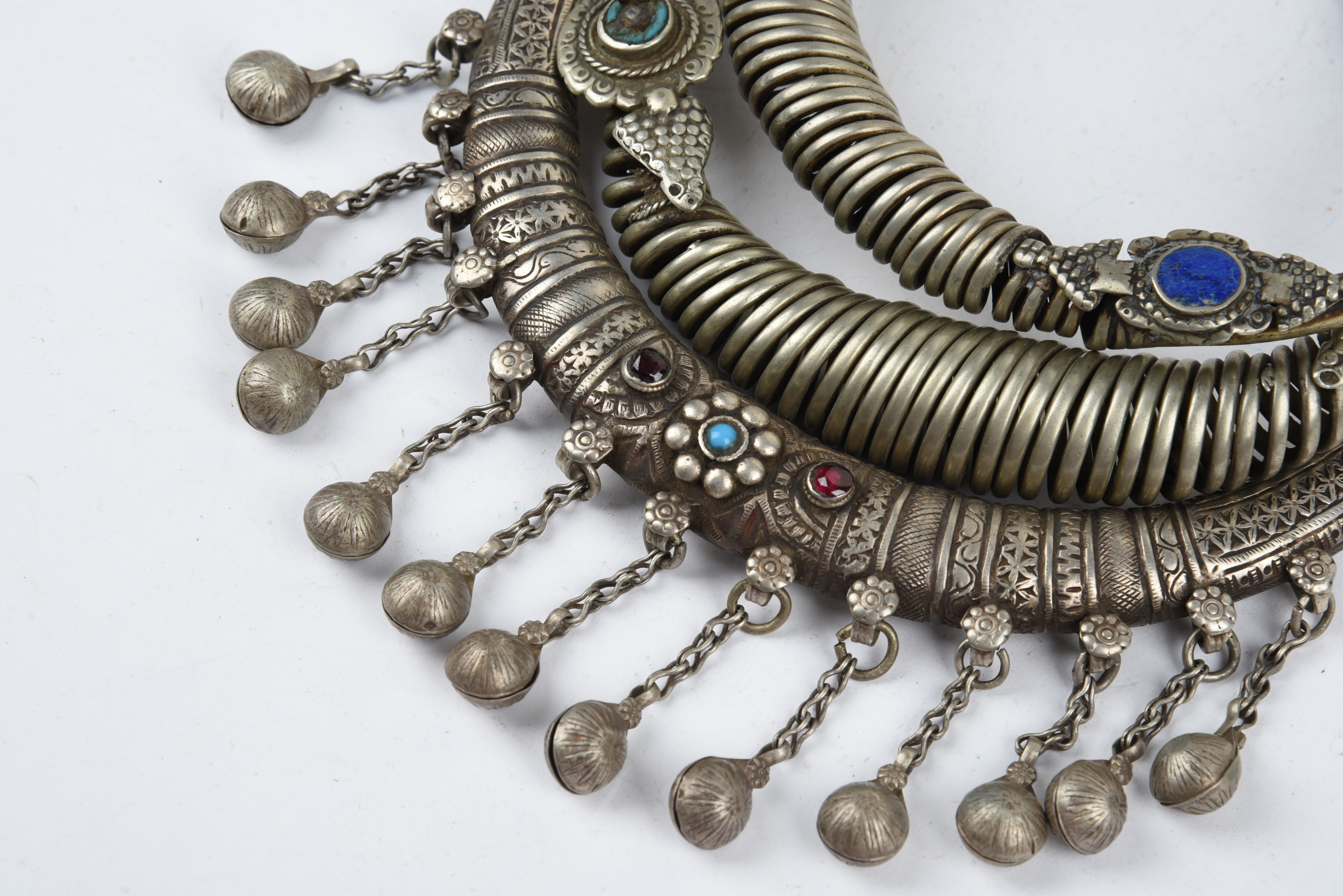silver coloured metal with applied blue stone and red and blue glass beads, the larger with chased decoration and hung with bells, 20.5cm wide. (3)