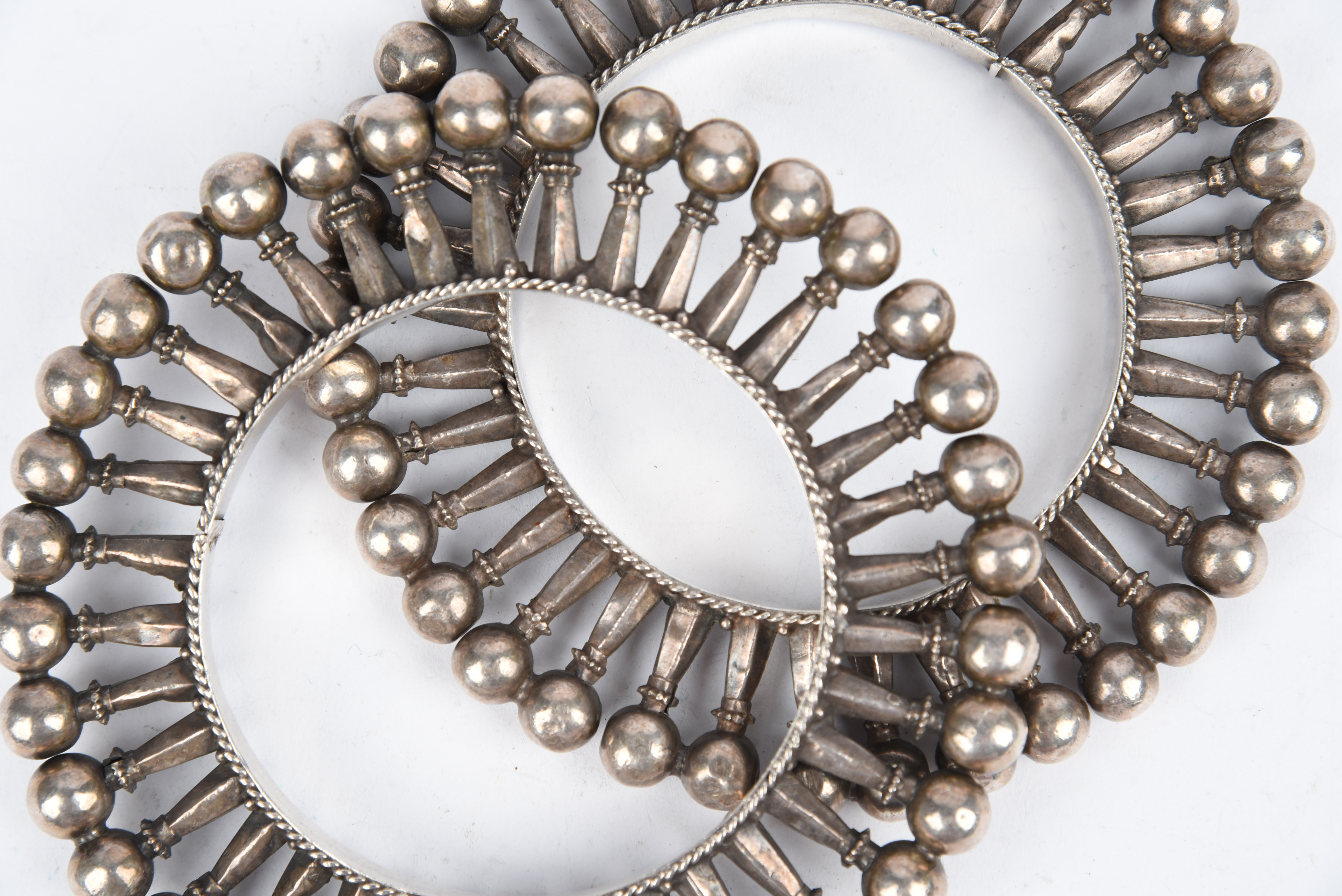 silver coloured metal with thirty six spheres on collared faceted cones,