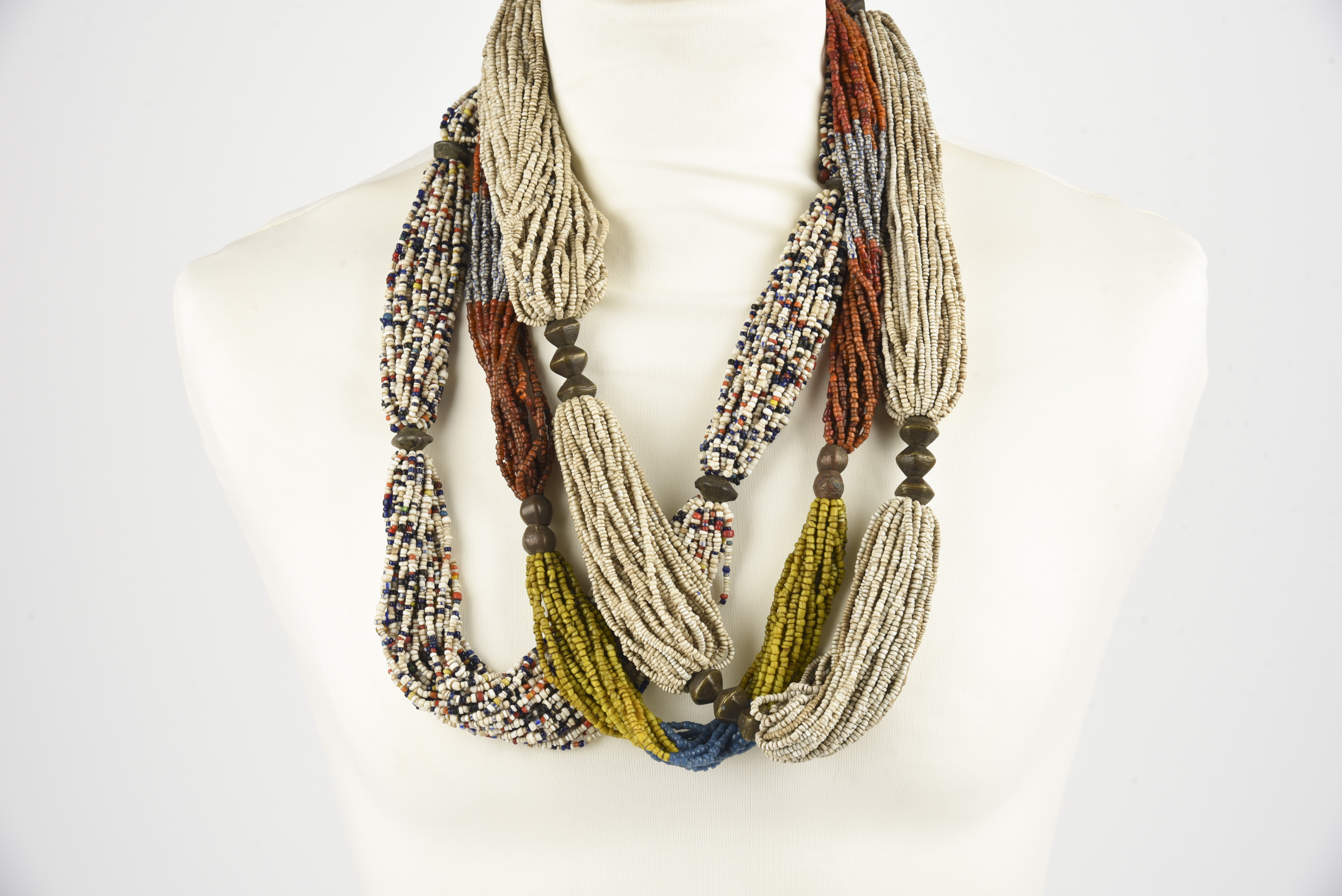 white and coloured glass beads with differing brass hexagonal beads,