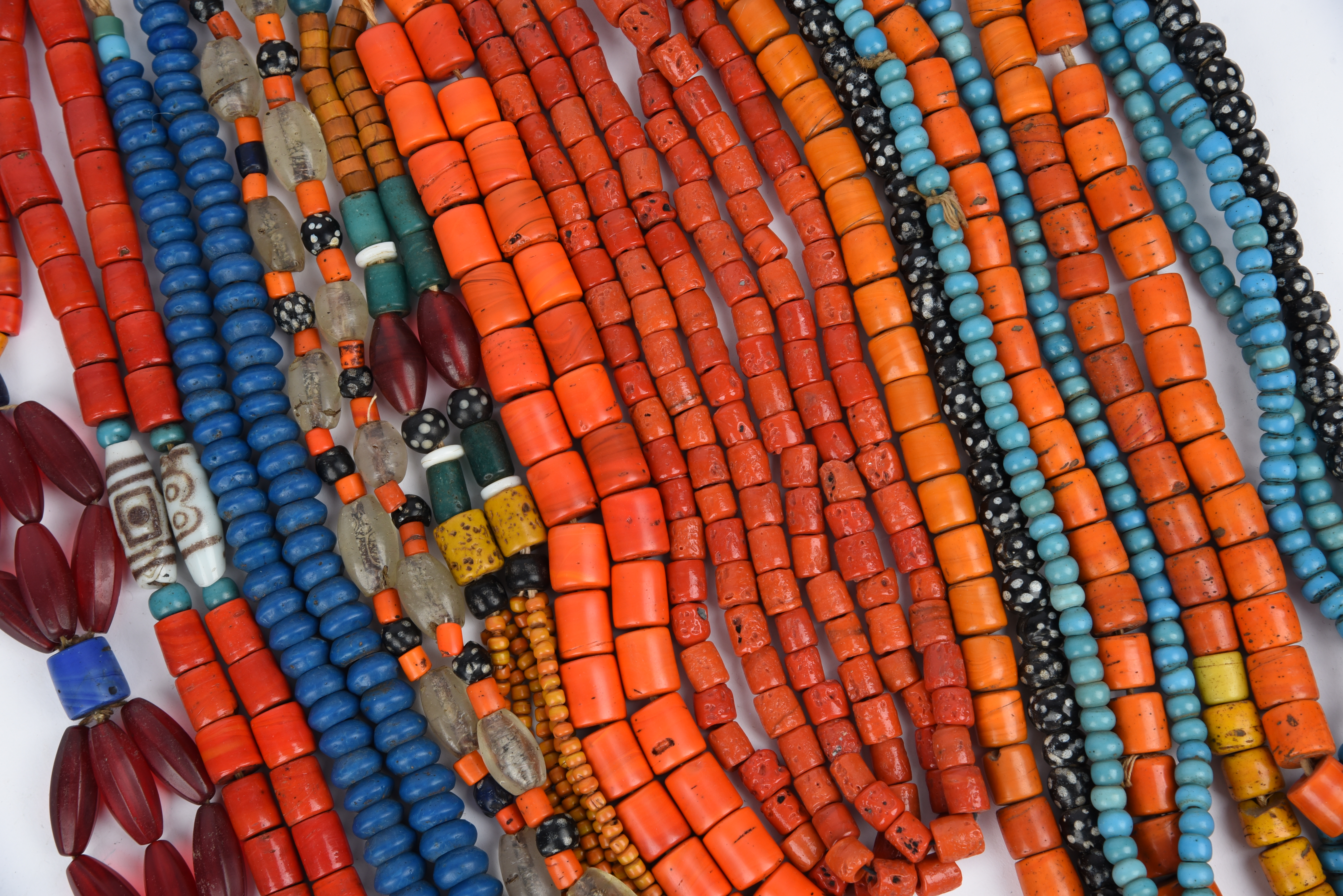 coloured glass beads, included one with five linked at the top, single and multi strand,