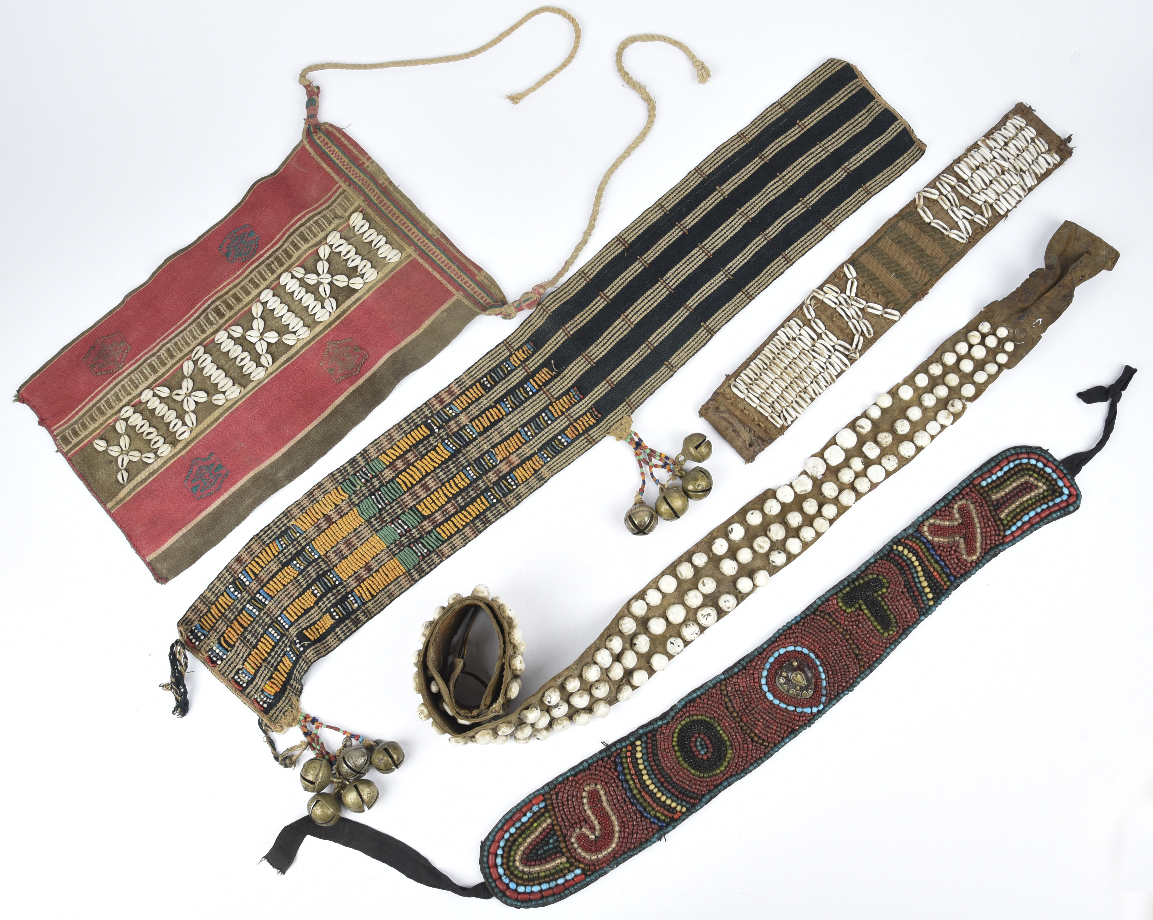 a cloth sash with bands of beads, two buttons and hung with nine brass bells, 84cm long, a leather belt with with three rows of applied shells and with a brass buckle, 144cm long, a Naga cloth belt with applied cut cowrie shells, 45.5cm long and a Naga cloth apron with applied cowrie shells, 41cm long. (5)