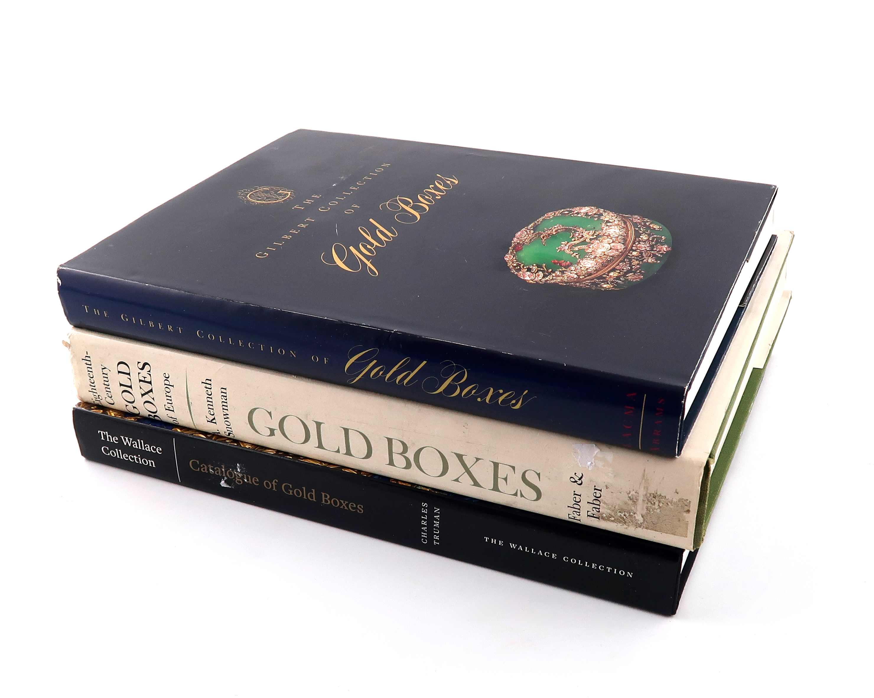 Snowman, K., Eighteenth-Century Gold boxes of Europe, Faber and Faber, 1966, hard bound with dust wrapper, plus Truman, C., The Wallace Collection Gold Boxes, 2013, hard back with dust wrapper, and The Gilbert Collection of Gold Boxes, by the same author, 1991, both with a presentation inscription and signed by the author. (3)