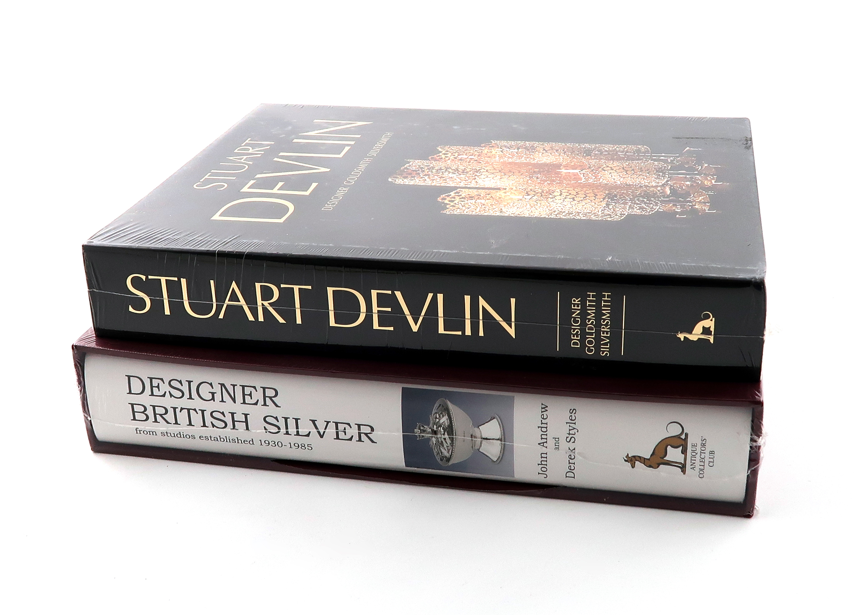 Devlin, C., and Simkin, V., Stuart Devlin, Designer, Goldsmith Silversmith, ACC Art Books Ltd., 2018, hard back with dust wrapper, still wrapped in cellophane, plus Andrew, J., and Styles, D. Designer British Silver, Antique Collector's Club, 2015, hard back with dust wrapper and sleeve, still wrapped in cellophane. (2)