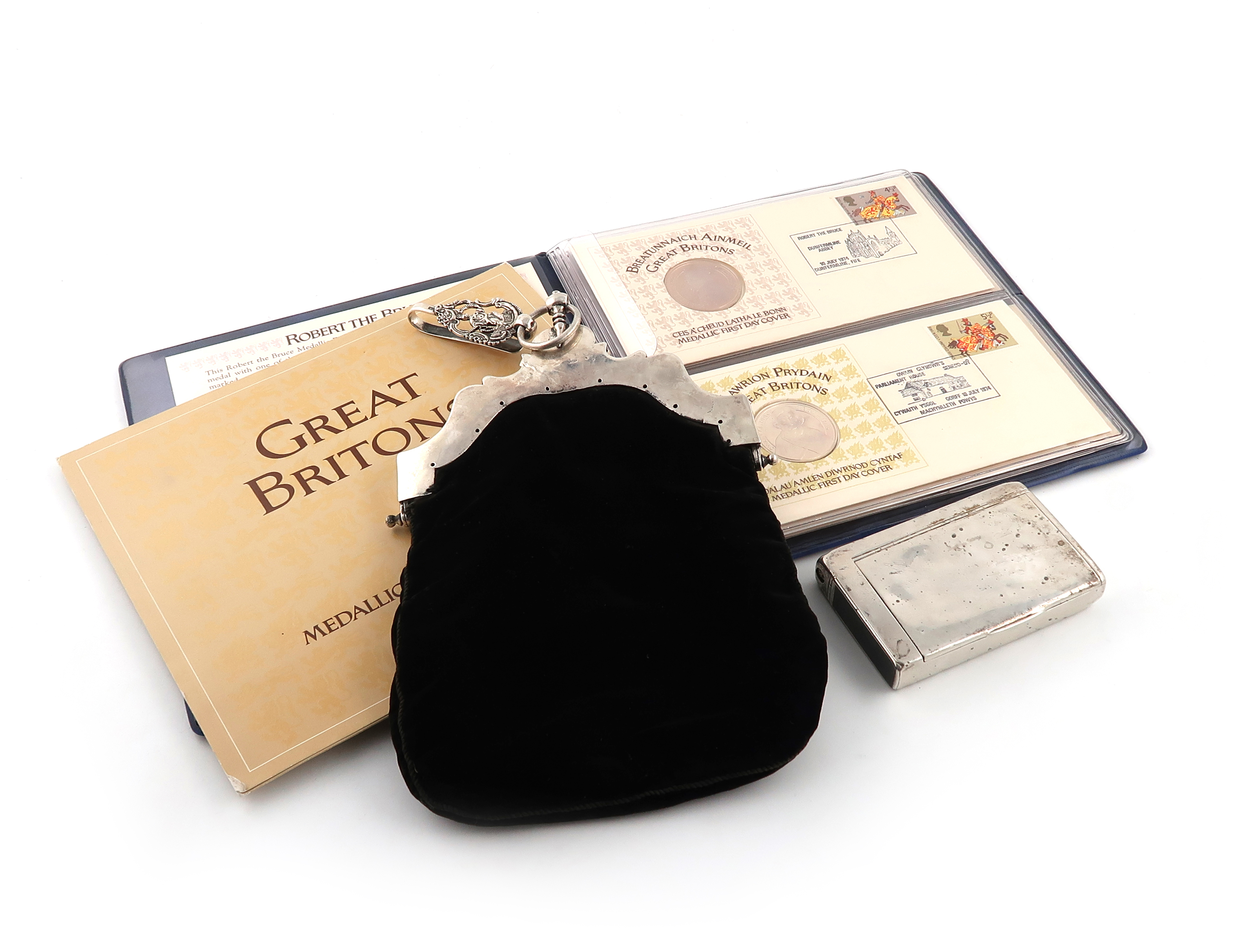 comprising: a Dutch silver mounted black velvet bag, scalloped shaped silver mount, engraved scroll, boats and parrot decoration, ring attachment with a figural pierced belt clip, a 19th century Russian cigarette box by Ivan Saltykov, Moscow circa 1890, rectangular form, central hinged cover with a hinged striker to the side, and gilded interior, plus four 'Great Britons, Medallic First Day Covers including Robert the Bruce, Owen Glendower, Henry V and Edward the Black Prince, total approx. weighable 5.9oz. (3)