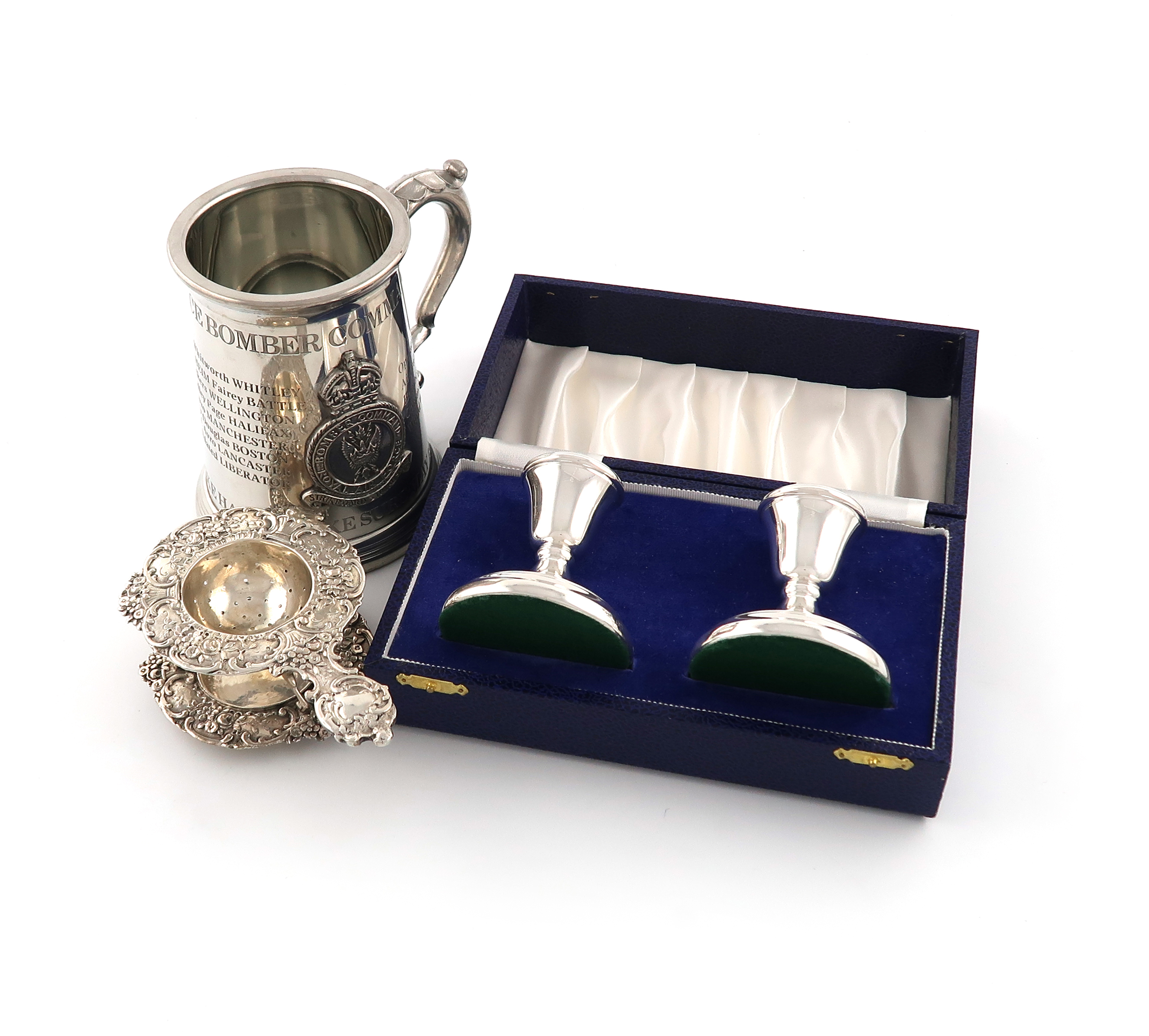 comprising silver items: a cased pair of modern dwarf candlesticks, Birmingham 1983, cased, a German tea strainer and stand, with foliate and scroll decoration, and a modern pewter commemorative tankard celebrating the Royal Air Force Bomber Command, approx. weighable 4oz. (4)