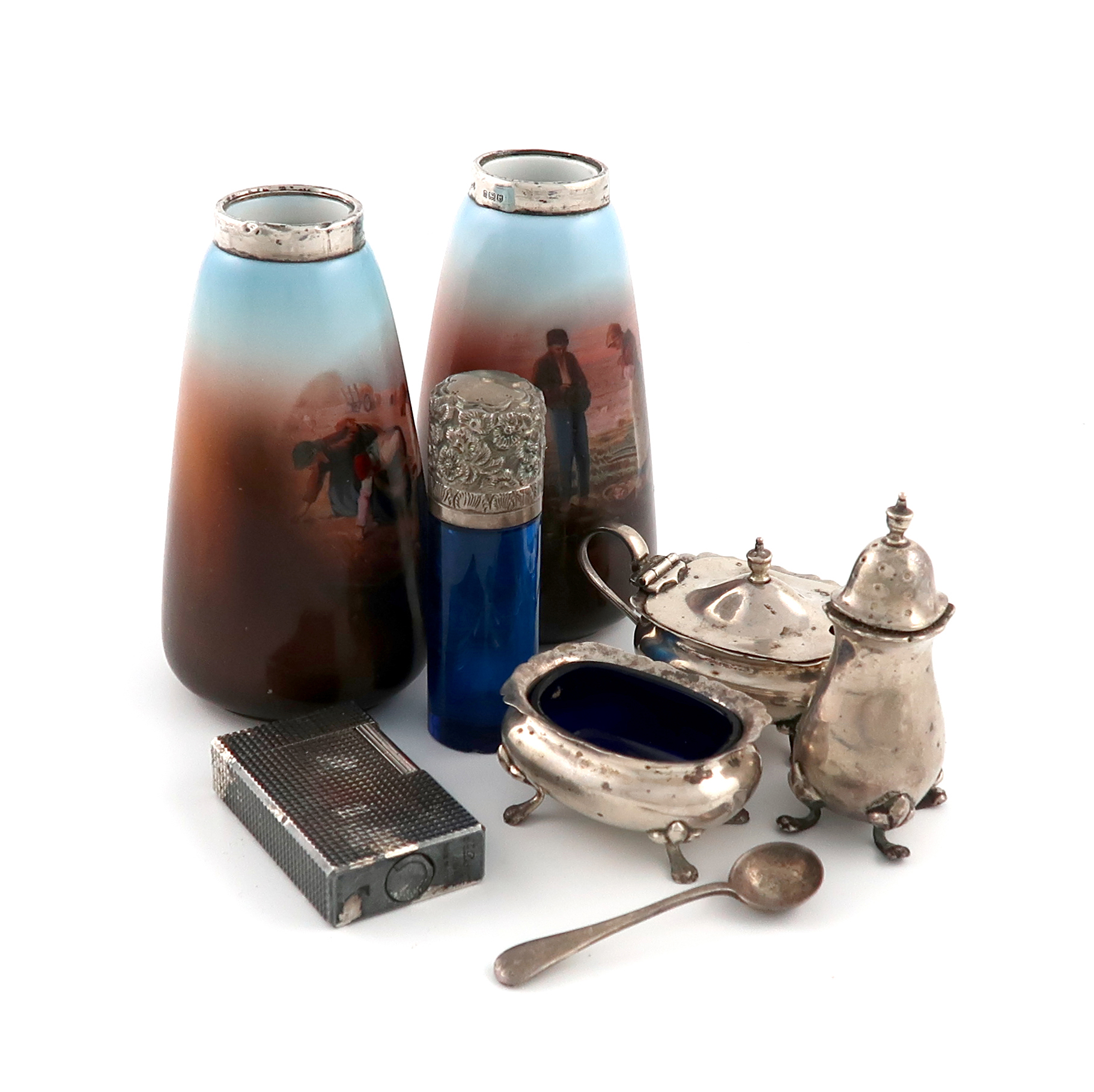 comprising silver items: a Victorian blue glass scent bottle, the hinged cover and mount, Birmingham 1893, plus a three piece condiment set, with a salt spoon, an electroplated French cigarette lighter, by Dupont, Paris, and a pair of Edwardian silver-mounted continental ceramic vases, the mounts London 1908, maker's mark worn, tapering circular form, decorated with harvest scenes, height 11.4cm, approx. weighable 3.3oz. (8)