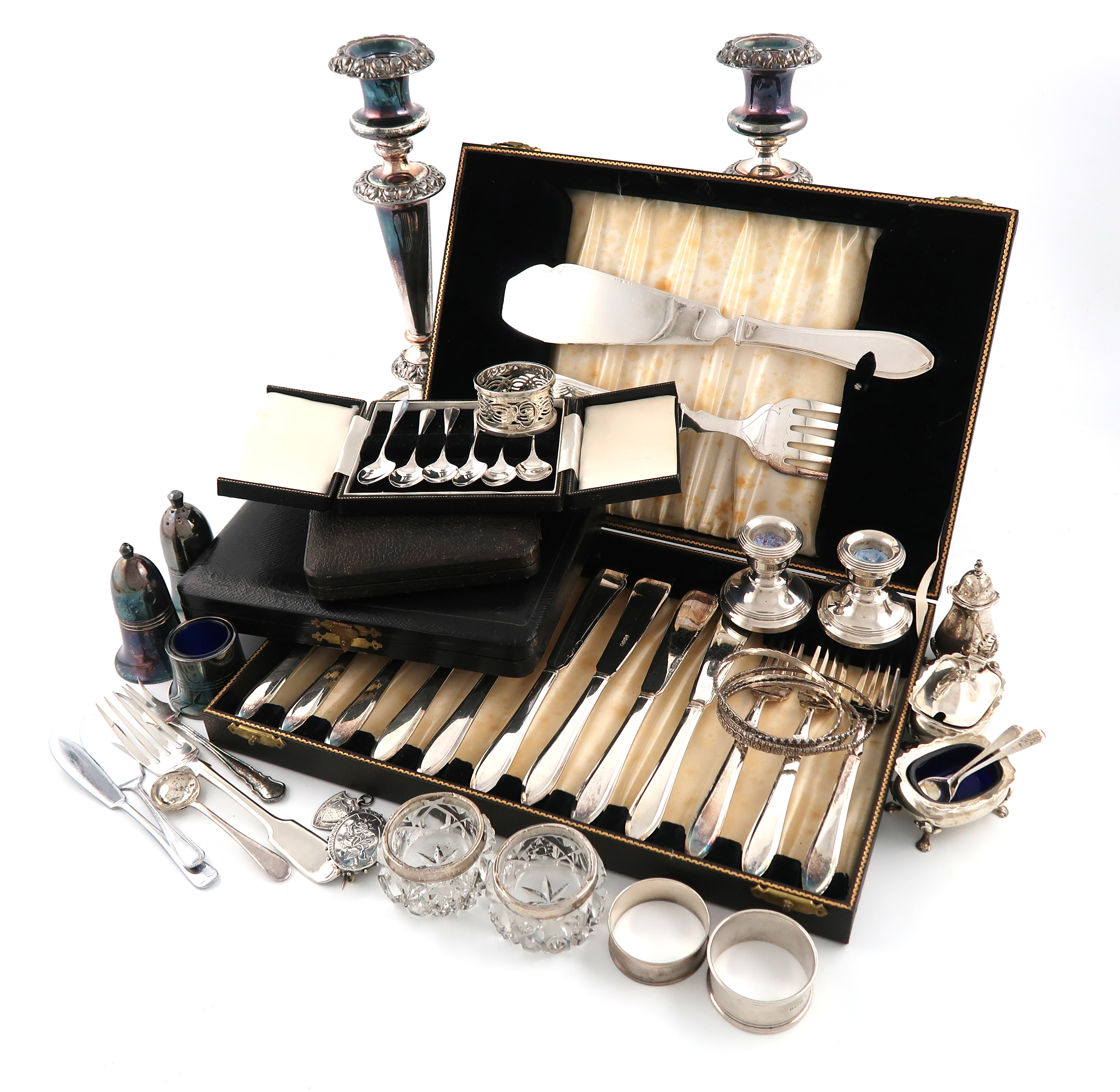 comprising silver: a pair silver dwarf candlesticks by Harrison Brothers & Howson Ltd, Birmingham 1996, a cased set of six teaspoons by Barker Brothers Silver Ltd, Birmingham 1936, a three piece cruet set by Harrods Ltd, Birmingham 1939, three napkin rings, a pair of silver rimmed glass salt cellars with salt spoons, four worn marked bracelets, a foliate pin, set of six silver handled knives, shield medallion and another cased set of six tea spoons, plated items comprising: a pair of candlesticks, and other flatware, total approx. weighable 11.2oz (qty)