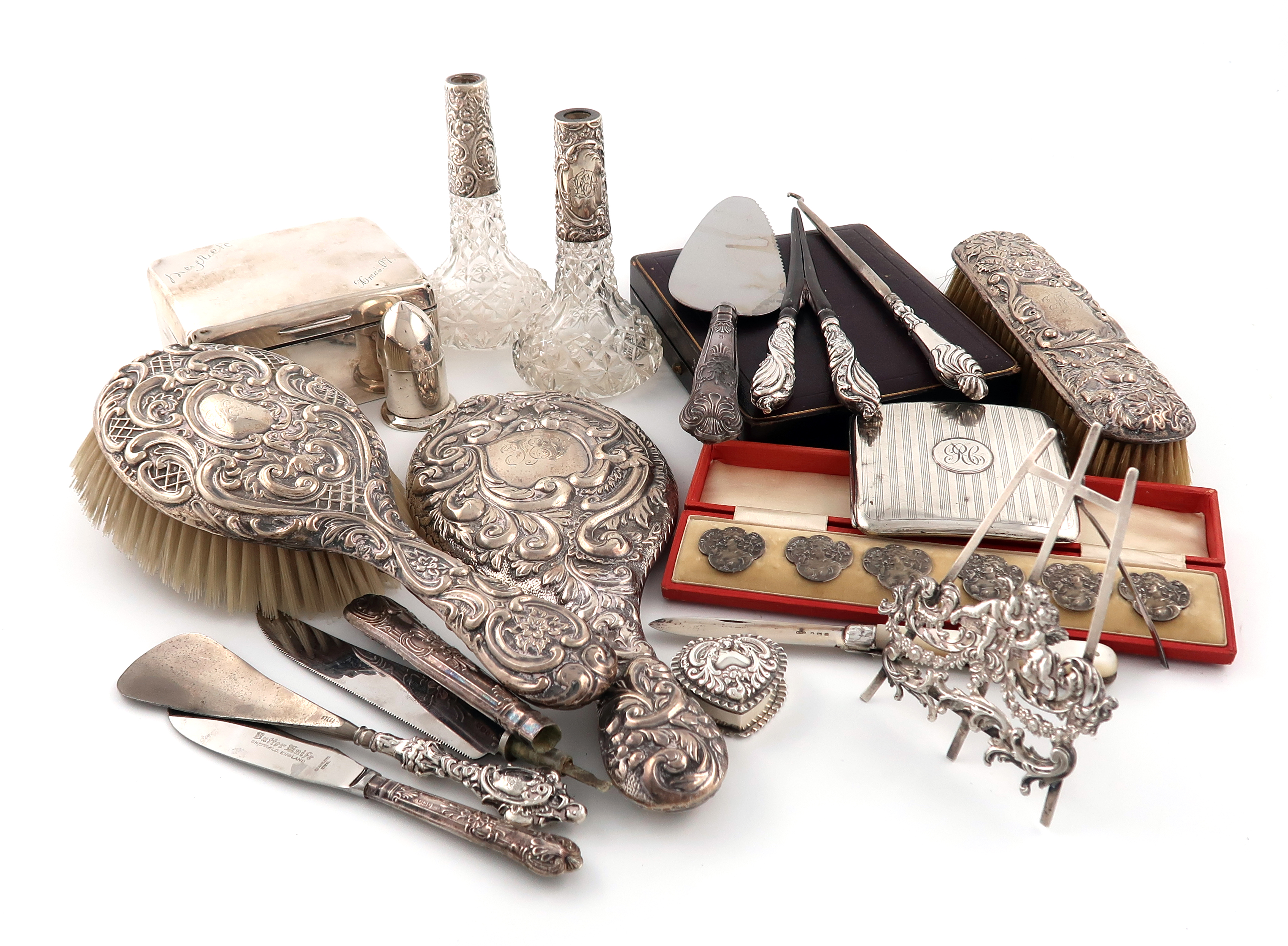 comprising: a cased set of six Edwardian Art Nouveau buttons, by Walker and Hall, Chester 1906, shaped form with a female head and foliate decoration, a menu card holder, Birmingham 1900, cherub and foliate scroll decoration, easel back, a heart shaped box, a fruit knife, a novelty inkwell modelled as an artillery shell, a cigarette box, a cigarette case, a cased set of six teaspoons, a pair of silver-mounted glass scent bottles, lacking stoppers, a hand mirror, two brushes, a button hook, a shoe horn, a pair of glove stretchers, and a silver-handled slice, and two knives, approx. weighable 5oz. (qty)