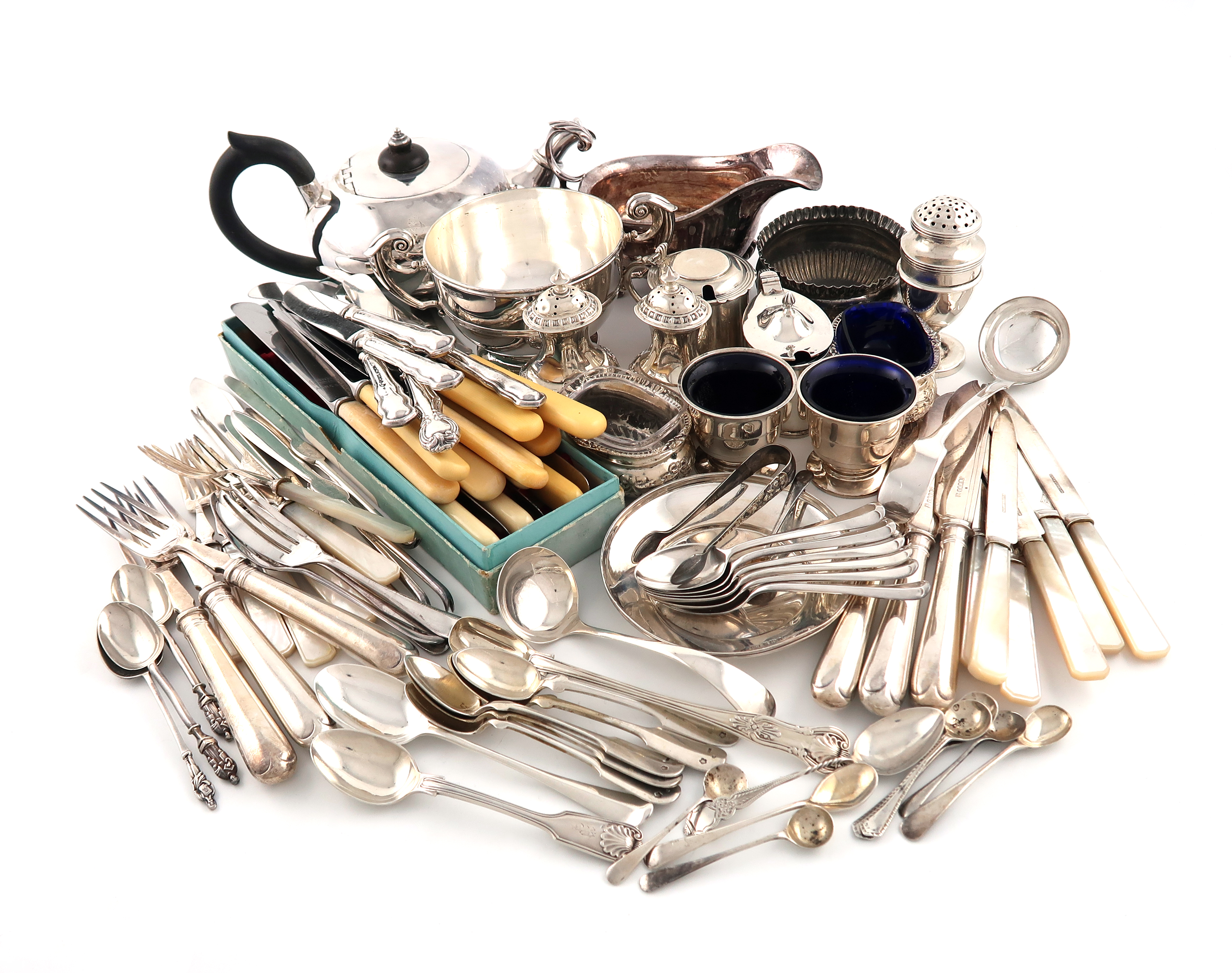 comprising silver items: a George IV bachelor's teapot of compressed circular form, by William Eaton, London 1825, flush-hinged cover, a two-handled bowl, two mustard pots, a pair of salt cellars, a dish, a pair of pepper pots, a pair of salt cellars, a pepper pot, plus various salt spoons and flatware, plus a small quantity of electroplated flatware, a sauce boat and bowl and ivorine handled knives, approx. weighable 40oz. (qty)