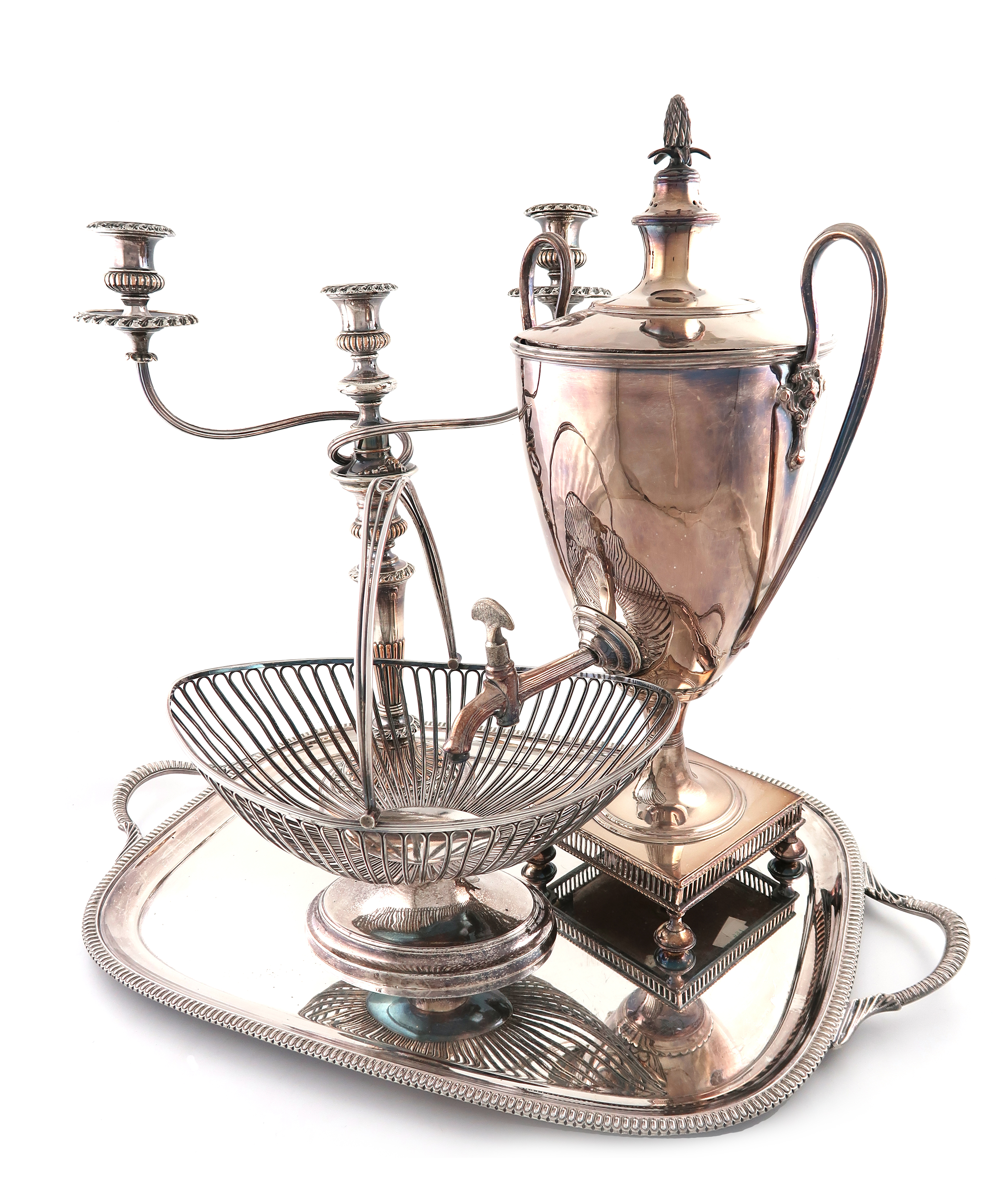 comprising: an old Sheffield plated two-handled tea urn, of vase form, the pull-off cover with a pineapple finial, scroll handles, on a raised square base with a pierced gadroon apron, height 53cm, a three-light candelabrum, tapering circular form, fluted decoration, a wire-work basket, with a swing handle, on an oval foot, and an electroplated two-handled tray. (4)