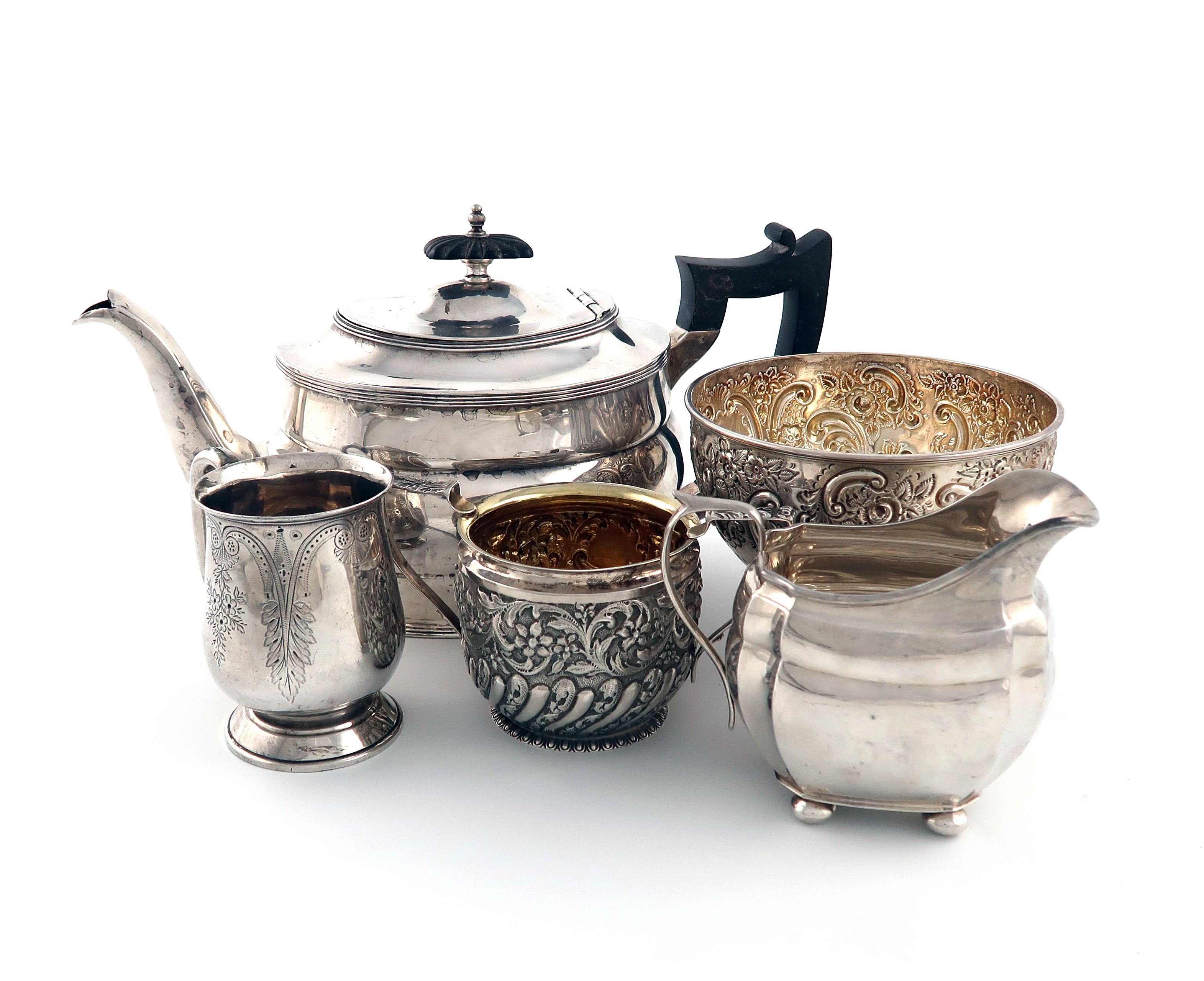 comprising: a teapot by Harrison Brothers, Sheffield 1919, oval form, scroll handle, a cream jug by J B Chatterley & Sons Ltd, Chester 1931, a christening cup, an embossed bowl, London 1891, and a two-handled sugar bowl, approx. weight 40.9oz (5)