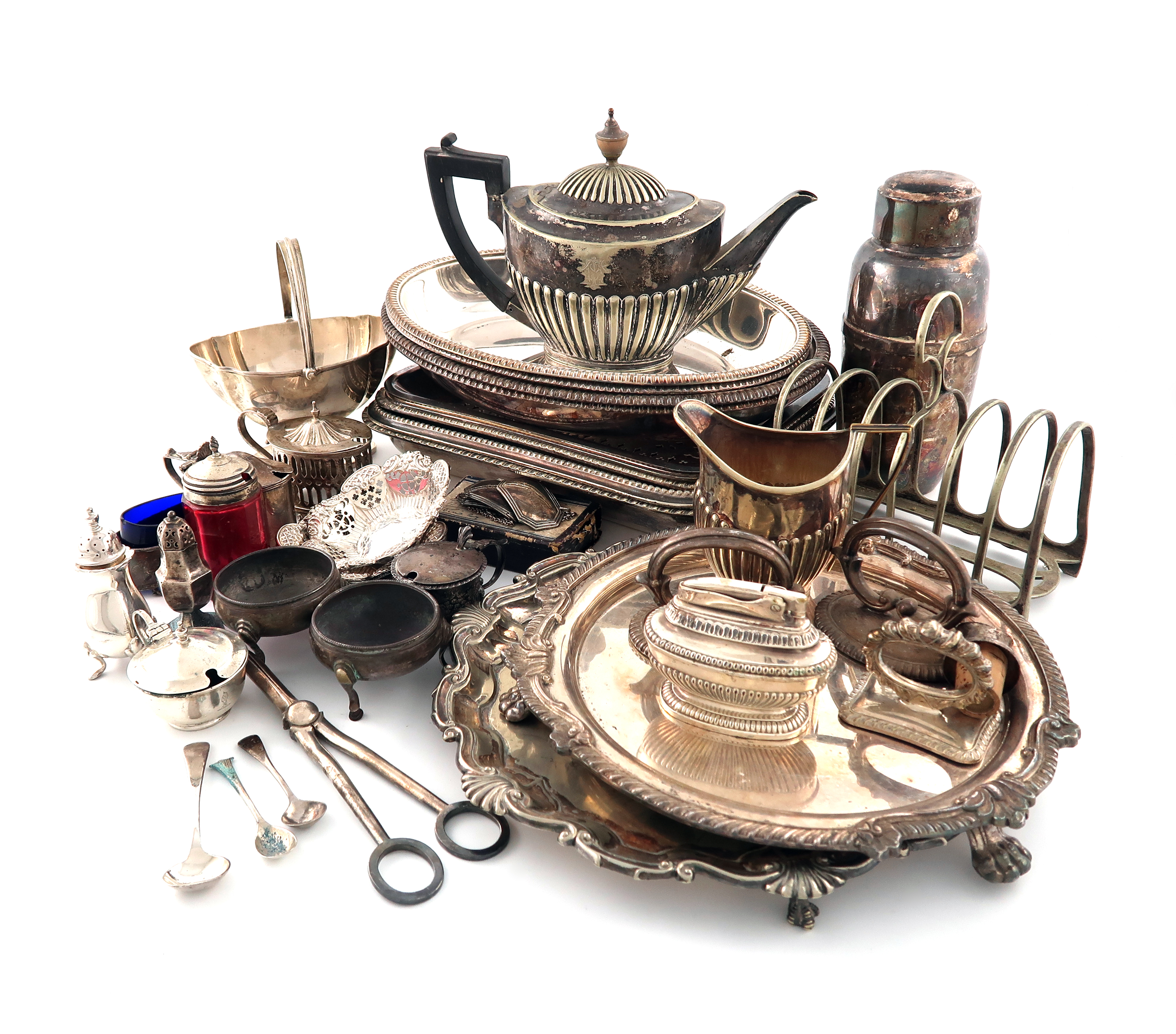 comprising silver items: a swing handled sugar basket by Elkington & Co Ltd, Birmingham 1913, reeded borders, swing handle, on a shaped foot, a mustard pot by George Nathan & Ridley Hayes, Chester 1898, four further mustard pots, a set of four pierced bon bon dishes by A & J Zimmerman, London 1897, a matched pair of salt cellars, one marked London 1794, circular cauldron form, on three hoof feet, a pepper pot, two condiment spoons and a salt cellar. plus a electroplated cocktail shaker, teapot, toast rack, two salvers, serving dishes, a cream jug, table lighter, and decanter labels, weighable approx. 20oz. (qty)