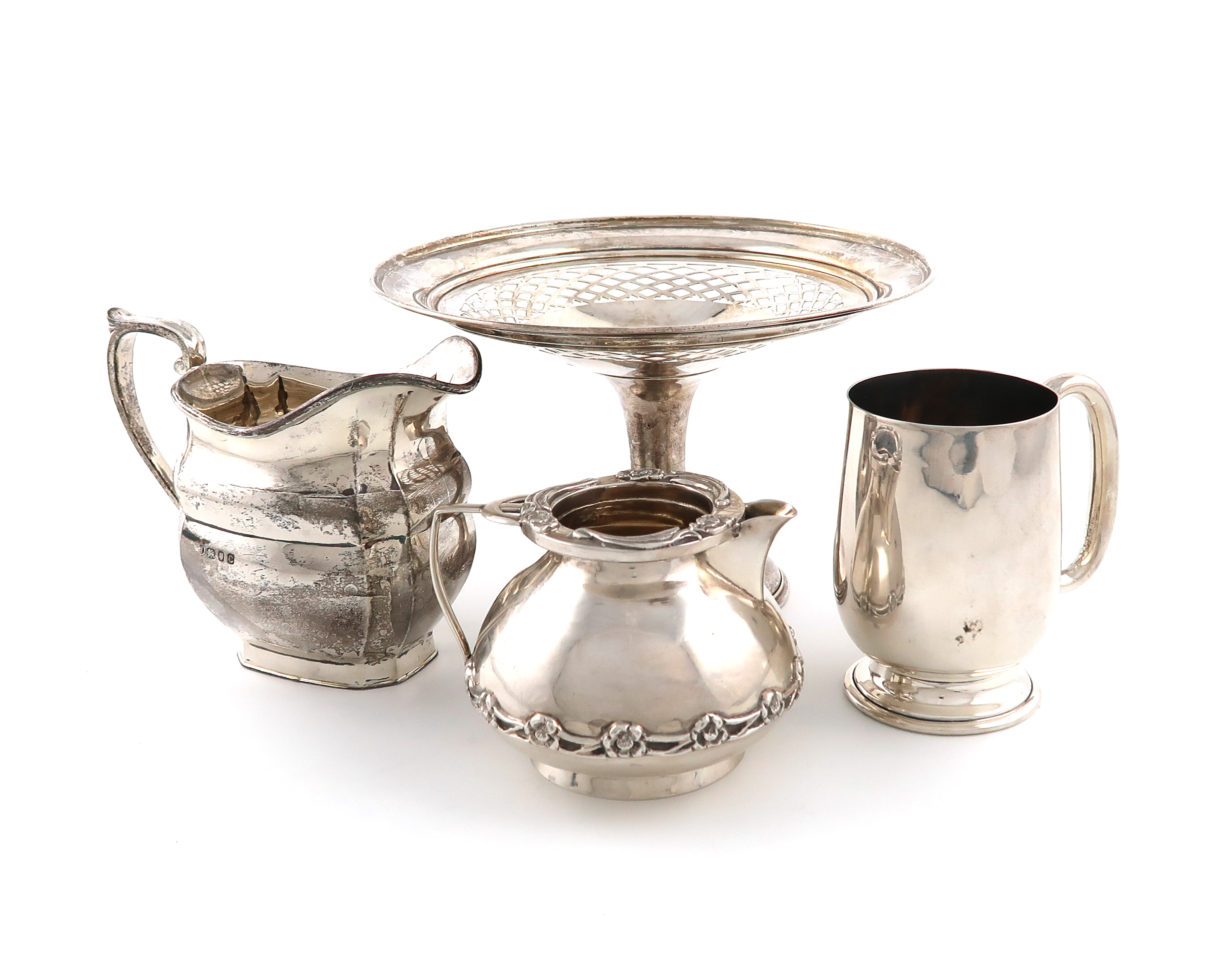 comprising: an Edwardian christening mug by Joseph Gloster, Birmingham 1901, of circular form, scroll handle, on a reeded circular foot, an Edwardian tazza by Marks & Cohen, Birmingham 1907, circular form, a cream jug, maker's marks worn, London 1938, oblong shaped form, canted corners, scroll form handle on an oblong shaped foot, and an Edwardian cream jug by Jones & Crompton, Birmingham 1902, circular bellied form, with foliate motif decorative band, a foliate decorated rim, scroll handle, on a circular foot, total approx. weight 19.6oz. (4)